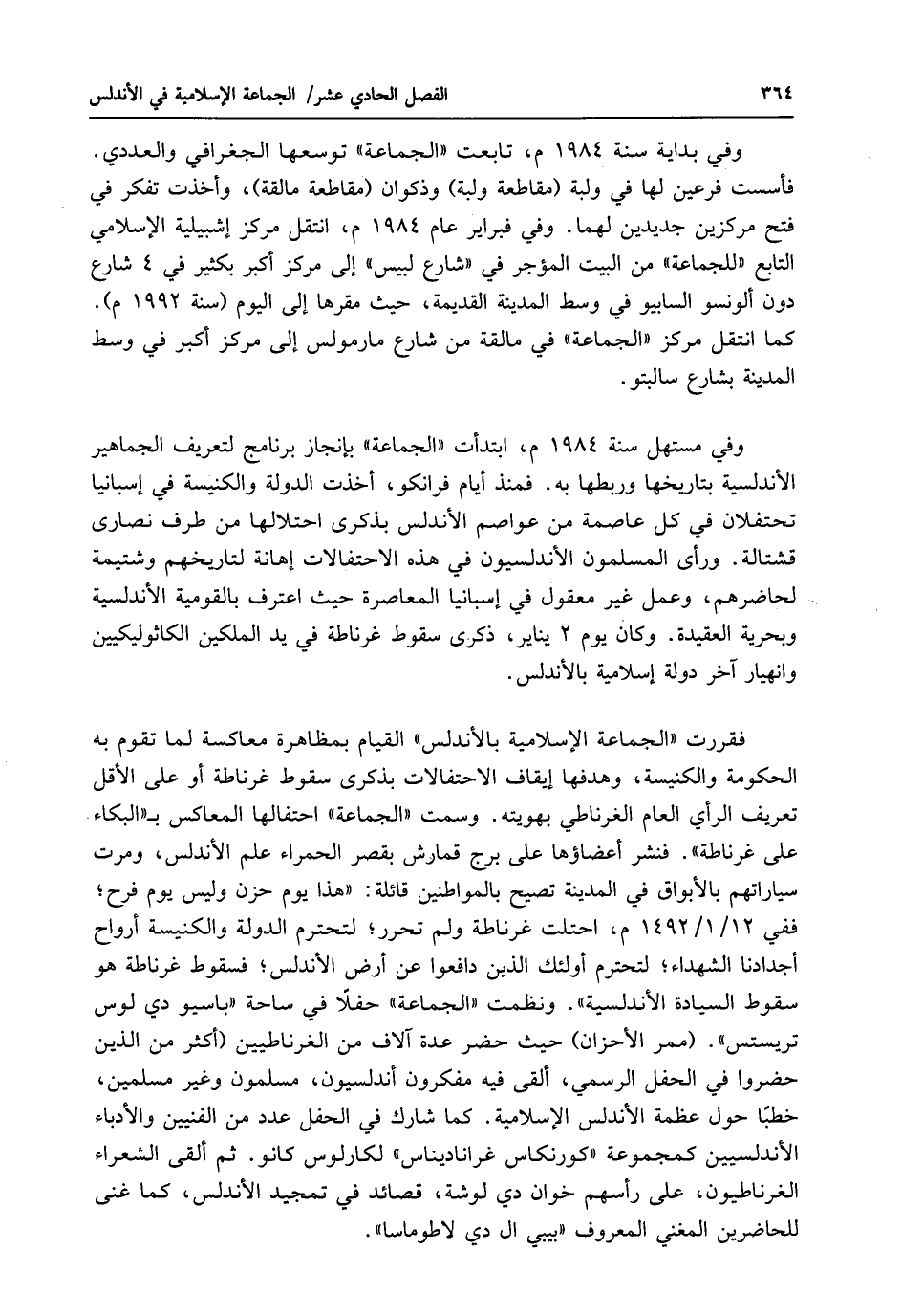 وفي مستهل سنة 1984 م، ابتدأت "الجماعة" بإنجاز برنامج لتعريف الجماهير الأندلسية بتاريخها وربطها به. فمنذ أيام فرانكو، أخذت الدولة والكنيسة في إسبانيا تحتفلان في كل عاصمة من عواصم الأندلس بذكرى احتلالها من طرف نصارى قشتالة. ورأى المسلمون الأندلسيون في هذه الاحتفالات إهانة لتاريخهم وشتيمة لحاضرهم، وعمل غير معقول في إسبانيا المعاصرة حيث اعتُرف بالقومية الأندلسية وبحرية العقيدة. وكان يوم 2 يناير، ذكرى سقوط غرناطة في يد الملكين الكاثوليكيين وانهيار آخر دولة إسلامية بالأندلس.