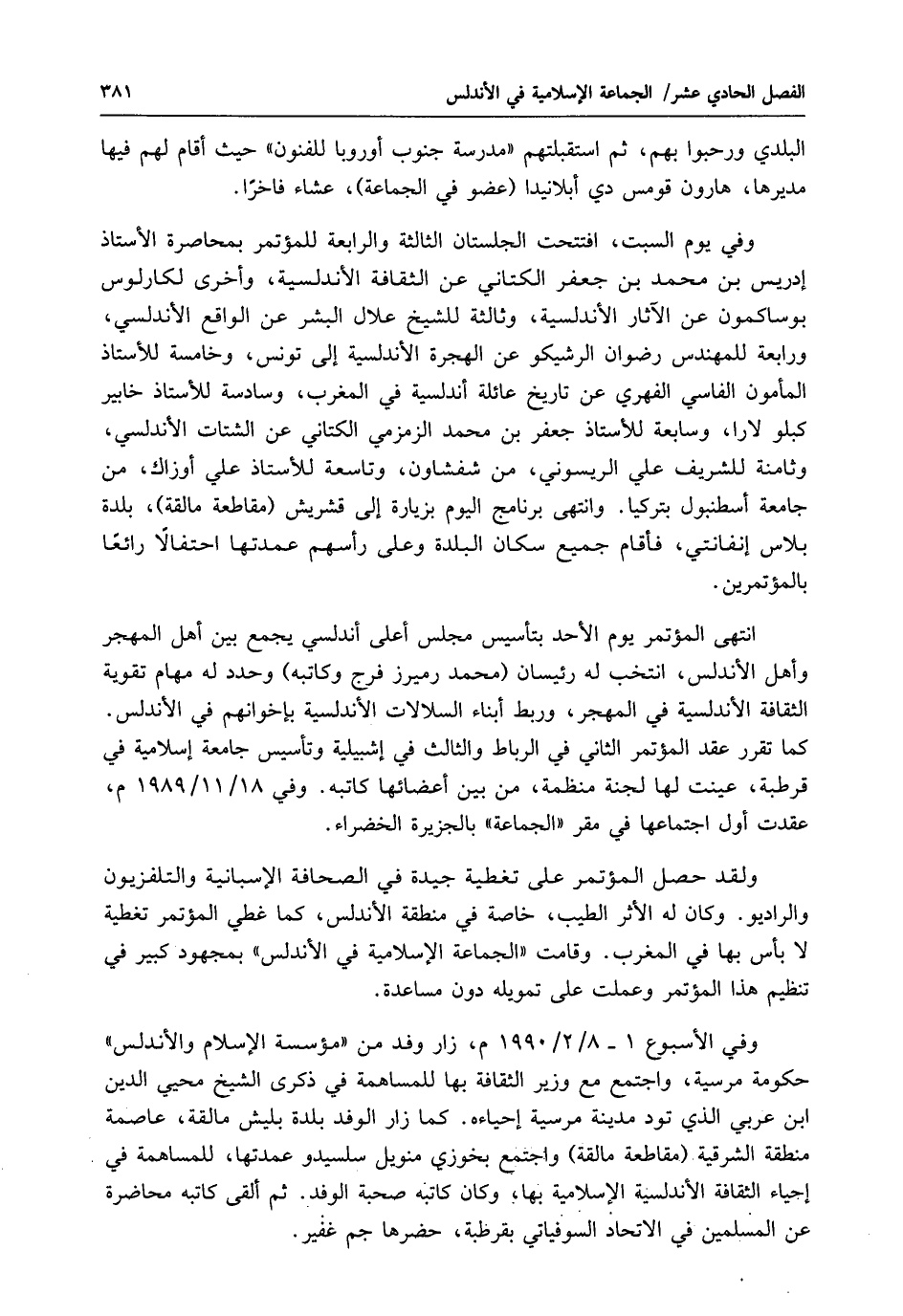 وفي يوم السبت، افتتحت الجلستان الثالثة والرابعة للمؤتمر بمحاضرة الأستاذ إدريس بن محمد بن جعفر الكتاني عن الثقافة الأندلسية، وأخرى لكارلوس بوساكمون عن الآثار الأندلسية، وثالثة للشيخ علال البشر عن الواقع الأندلسي، ورابعة للمهندس رضوان الرشيكو عن الهجرة الأندلسية إلى تونس، وخامسة للأستاذ المأمون الفاسي الفهري عن تاريخ عائلة أندلسية في المغرب، وسادسة للأستاذ خابير كبلو لارا، وسابعة للأستاذ جعفر بن محمد الزمزمي الكتاني عن الشتات الأندلسي، وثامنة للشريف علي الريسوني، من شفشاون، وتاسعة للأستاذ علي أوزاك، من جامعة إسطنبول بتركيا. وانتهى برنامج اليوم بزيارة إلى قشريش (مقاطعة مالقة)، بلدة بلاس إنفانتي، فأقام جميع سكان البلدة وعلى رأسهم عمدتها احتفالاً رائعًا بالمؤتمرين.