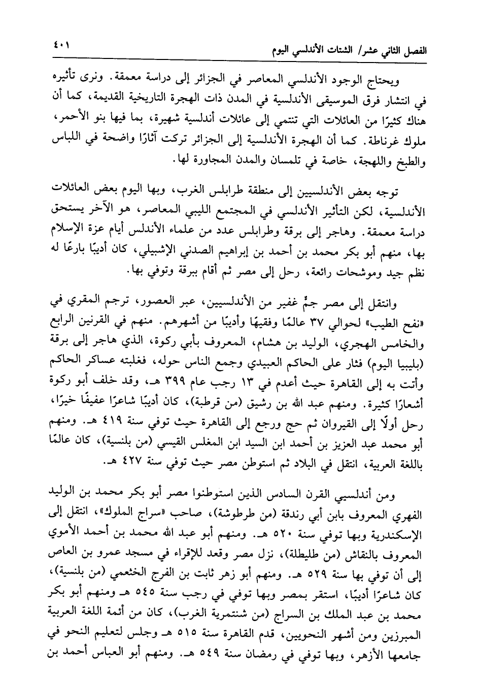ومن أندلسيي القرن السادس الذين استوطنوا مصر أبو بكر محمد بن الوليد الفهري المعروف بابن أبي رندقة (من طرطوشة)، صاحب "سراج الملوك"، انتقل إلى الإسكندرية وبها توفي سنة 520 هـ. ومنهم أبو عبد الله محمد بن أحمد الأموي المعروف بالنقاش (من طليطلة)، نزل مصر وقعد للإقراء في مسجد عمرو بن العاص إلى أن توفي بها سنة 529 هـ. ومنهم أبو زهر ثابت بن الفرج الخثعمي (من بلنسية)، كان شاعرًا أديبًا، استقر بمصر وبها توفي في رجب سنة 545 هـ ومنهم أبو بكر محمد بن عبد الملك بن السراج (من شنتمرية الغرب)، كان من أئمة اللغة العربية المبرزين ومن أشهر النحويين، قدم القاهرة سنة 515 هـ وجلس لتعليم النحو في جامعها الأزهر، وبها توفي في رمضان سنة 549 هـ. ومنهم أبو العباس أحمد بن