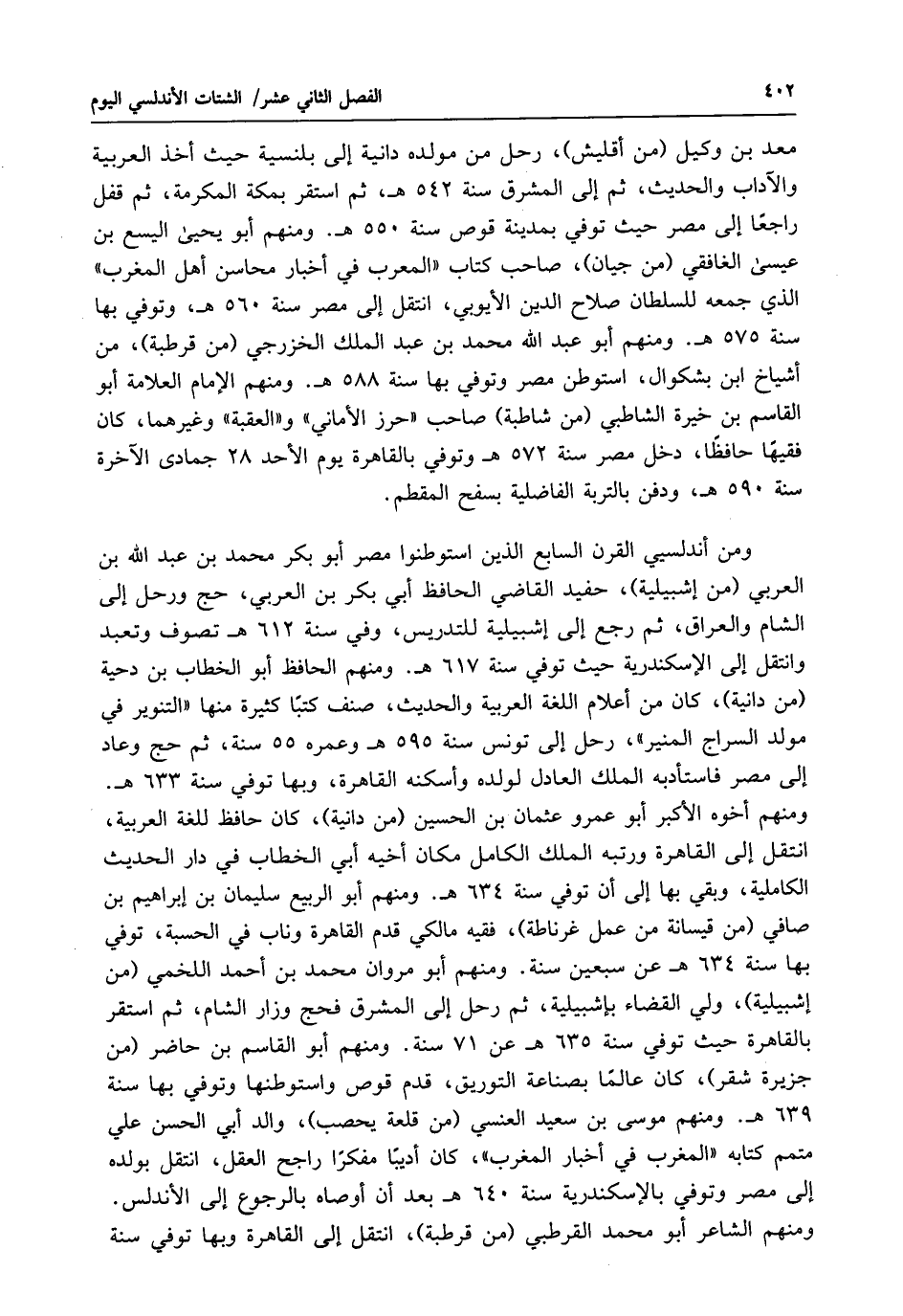معد بن وكيل (من أقليش)، رحل من مولده دانية إلى بلنسية حيث أخذ العربية والآداب والحديث، ثم إلى المشرق سنة 542 هـ، ثم استقر بمكة المكرمة، ثم قفل راجعًا إلى مصر حيث توفي بمدينة قوص سنة 550 هـ. ومنهم أبو يحيى اليسع بن عيسى الغافقي (من جيان)، صاحب كتاب "المعرب في أخبار محاسن أهل المغرب" الذي جمعه للسلطان صلاح الدين الأيوبي، انتقل إلى مصر سنة 560 هـ، وتوفي بها سنة 575 هـ. ومنهم أبو عبد الله محمد بن عبد الملك الخزرجي (من قرطبة)، من أشياخ ابن بشكوال، استوطن مصر وتوفي بها سنة 588 هـ. ومنهم الإمام العلامة أبو القاسم بن خيرة الشاطبي (من شاطبة) صاحب "حرز الأماني" و"العقبة" وغيرهما، كان فقيهًا حافظًا، دخل مصر سنة 572 هـ وتوفي بالقاهرة يوم الأحد 28 جمادى الآخرة سنة 590 هـ، ودفن بالتربة الفاضلية بسفح المقطم.