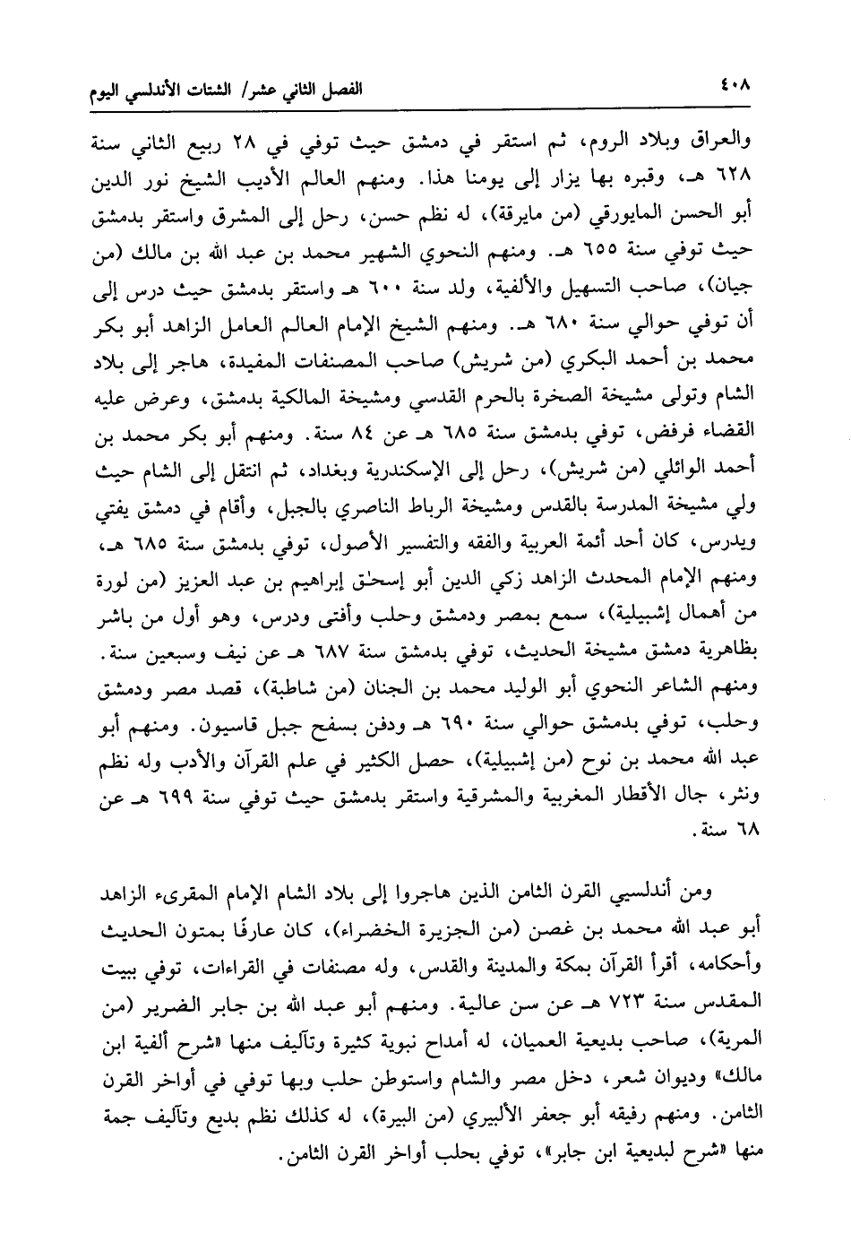 والعراق وبلاد الروم، ثم استقر في دمشق حيث توفي في 28 ربيع الثاني سنة 628 هـ، وقبره بها يزار إلى يومنا هذا. ومنهم العالم الأديب الشيخ نور الدين أبو الحسن المايورقي (من مايرقة)، له نظم حسن، رحل إلى المشرق واستقر بدمشق حيث توفي سنة 655 هـ. ومنهم النحوي الشهير محمد بن عبد الله بن مالك (من جيان)، صاحب التسهيل والألفية، ولد سنة 600 هـ واستقر بدمشق حيث درس إلى أن توفي حوالي سنة 680 هـ. ومنهم الشيخ الإمام العالم العامل الزاهد أبو بكر محمد بن أحمد البكري (من شريش) صاحب المصنفات المفيدة، هاجر إلى بلاد الشام وتولى مشيخة الصخرة بالحرم القدسي ومشيخة المالكية بدمشق، وعرض عليه القضاء فرفض، توفي بدمشق سنة 685 هـ عن 84 سنة. ومنهم أبو بكر محمد بن أحمد الوائلي (من شريش)، رحل إلى الإسكندرية وبغداد، ثم انتقل إلى الشام حيث ولي مشيخة المدرسة بالقدس ومشيخة الرباط الناصري بالجبل، وأقام في دمشق يفتي ويدرس، كان أحد أئمة العربية والفقه والتفسير والأصول، توفي بدمشق سنة 685 هـ، ومنهم الإمام المحدث الزاهد زكي الدين أبو إسحق إبراهيم بن عبد العزيز (من لورة من أعمال إشبيلية)، سمع بمصر ودمشق وحلب وأفتى ودرس، وهو أول من باشر بظاهرية دمشق مشيخة الحديث، توفي بدمشق سنة 687 هـ عن نيف وسبعين سنة.