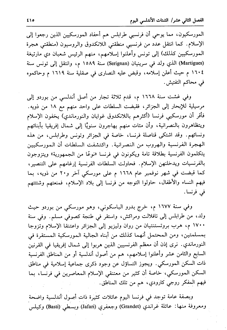 المورسكيون، مما يوحي أن فرنسيي طرابلس هم أحفاد المورسكيين الذين رجعوا إلى الإسلام. كما انتقل عدد من فرنسيي منطقتي اللانكدوق والروسيون (منطقتي هجرة المورسكيين كذلك) إلى تونس وأعلنوا إسلامهم، منهم الرئيس شعبان دي مارتيغة ( Martigues) الذي ولد في سرينيان ( Serignan) سنة 1589 م، وانتقل إلى تونس سنة 1604 م حيث أعلن إسلامه، وقبض عليه النصارى في صقلية سنة 1619 م وحاكموه في محاكم التفتيش.