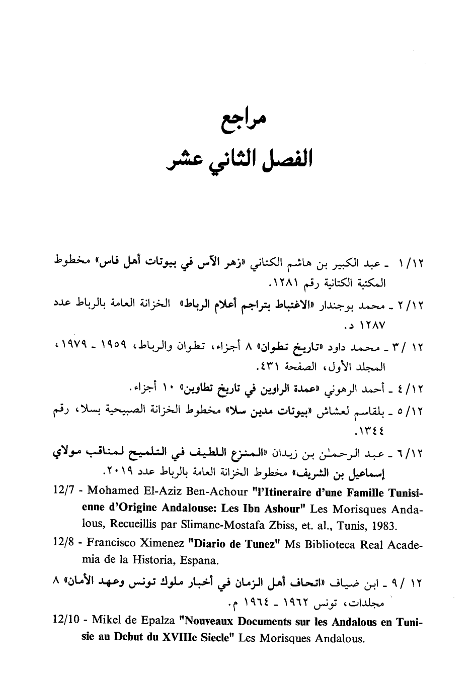 12/ 7 - Mohamed El - Aziz Ben - Achour "l'Itineraire d'une Famille Tunisi - enne d'Origine Andalouse: Les Ibn Ashour" Les Morisques Anda - lous, Recueillis par Slimane - Mostafa Zbiss, et. al., Tunis, 1983.