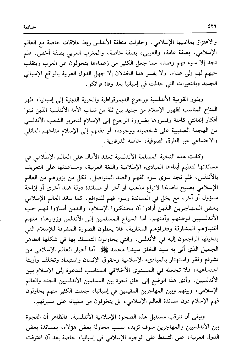 والاعتزاز بماضيها الإسلامي. وحاولت منطقة الأندلس ربط علاقات خاصة مع العالم الإسلامي، بصفة عامة، والعربي، بصفة خاصة، والمغرب العربي بصفة أخص. فلم تجد إلا سوء فهم وصد، مما جعل الكثير من زعمائها يتحولون عن العرب وينقلب حبهم لهم إلى عداء. ولا يفسر هذا الخذلان إلا جهل الدول العربية بالواقع الإسباني الجديد وبالتغيرات التي حدثت في إسبانيا بعد وفاة فرانكو.