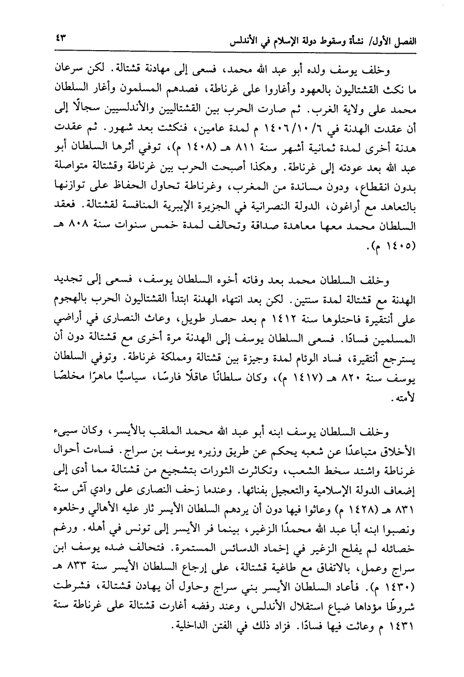 وخلف السلطان يوسف ابنه أبو عبد الله محمد الملقب بالأيسر، وكان سيىء الأخلاق متباعدًا عن شعبه يحكم عن طريق وزيره يوسف بن سراج. فساءت أحوال غرناطة واشتد سخط الشعب، وتكاثرت الثورات بتشجيع من قشتالة مما أدى إلى إضعاف الدولة الإسلامية والتعجيل بفنائها. وعندما زحف النصارى على وادي آش سنة 831 هـ (1428 م) وعاثوا فيها دون أن يردهم السلطان الأيسر ثار عليه الأهالي وخلعوه ونصبوا ابنه أبا عبد الله محمدًا الزغير، بينما فر الأيسر إلى تونس في أهله. ورغم خصائله لم يفلح الزغير في إخماد الدسائس المستمرة. فتحالف ضده يوسف ابن سراج وعمل، بالاتفاق مع طاغية قشتالة، على إرجاع السلطان الأيسر سنة 833 هـ (1430 م). فأعاد السلطان الأيسر بني سراج وحاول أن يهادن قشتالة، فشرطت شروطا مؤداها ضياع استقلال الأندلس، وعند رفضه أغارت قشتالة على غرناطة سنة 1431 م وعاثت فيها فسادًا. فزاد ذلك في الفتن الداخلية.