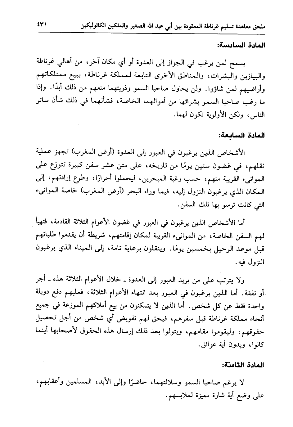 ولا يترتب على من يريد العبور إلى العدوة - خلال الأعوام الثلاثة هذه - أجر أو نفقة. أما الذين يرغبون في العبور بعد انتهاء الأعوام الثلاثة، فعليهم دفع دوبلة واحدة فقط عن كل شخص. أما الذين لا يتمكنون من بيع أملاكهم الموزعة في جميع أنحاء مملكة غرناطة قبل سفرهم، فيحق لهم تفويض أي شخص من أجل تحصيل حقوقهم، وليقوموا مقامهم، ويتولوا بعد ذلك إرسال هذه الحقوق لأصحابها أينما كانوا، وبدون أية عوائق.