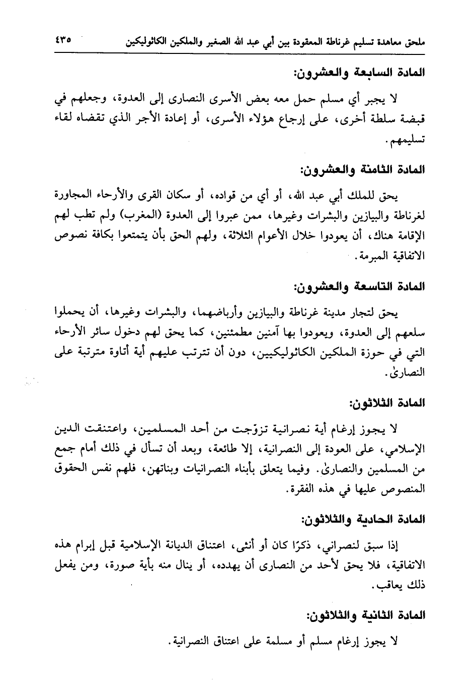 يحق للملك أبي عبد الله، أو أي من قواده، أو سكان القرى والأرحاء المجاورة لغرناطة والبيازين والبشرات وغيرها، ممن عبروا إلى العدوة (المغرب) ولم تطب لهم الإقامة هناك، أن يعودوا خلال الأعوام الثلاثة، ولهم الحق بأن يتمتعوا بكافة نصوص الاتفاقية المبرمة.