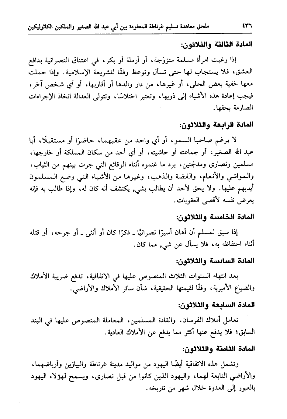 لا يرغم صاحبا السمو، أو أي واحد من عقبهما، حاضرًا أو مستقبلاً، أبا عبد الله الصغير، أو جماعته أو حاشيته، أو أي أحد من سكان المملكة أو خارجها، مسلمين ونصارى ومدجّنين، بردّ ما غنموه أثناء الوقائع التي جرت بينهم من الثياب، والمواشي والأنعام، والفضة والذهب، وغيرها من الأشياء التي وضع المسلمون أيديهم عليها. ولا يحق لأحد أن يطالب بشيء يكتشف أنه كان له، وإذا طالب به فإنه يعرض نفسه لأقصى العقوبات.
