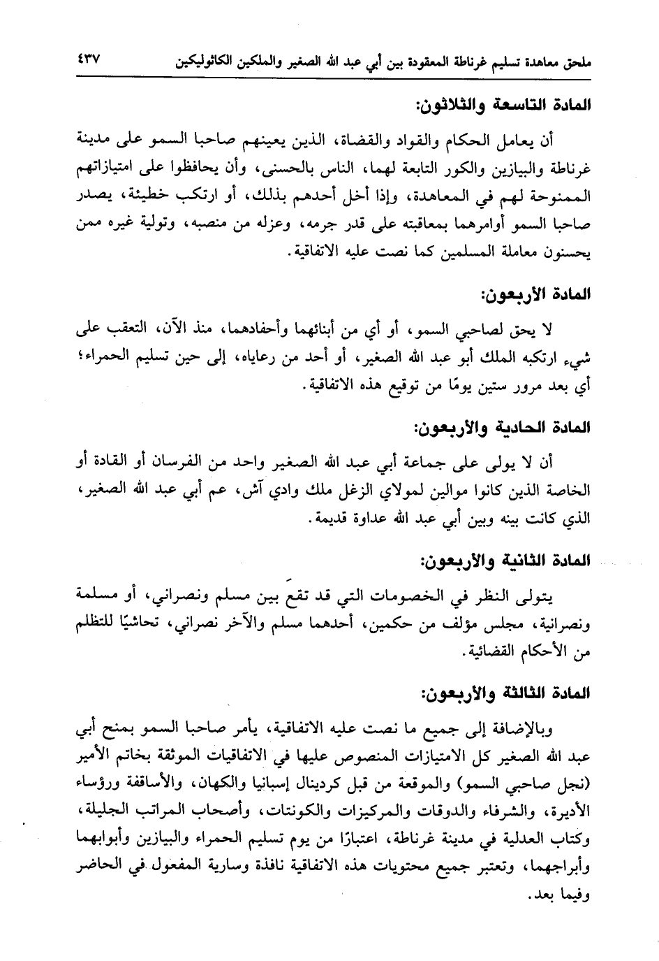 لا يحق لصاحبي السمو، أو أي من أبنائهما وأحفادهما، منذ الآن، التعقب على شيء ارتكبه الملك أبو عبد الله الصغير، أو أحد من رعاياه، إلى حين تسليم الحمراء؛ أي بعد مرور ستين يومًا من توقيع هذه الاتفاقية.