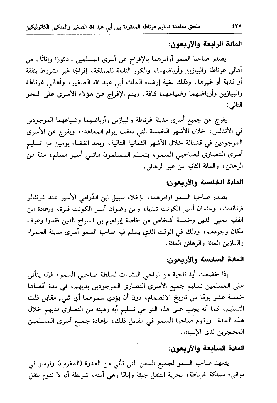 يصدر صاحبا السمو أوامرهما بالإفراج عن أسرى المسلمين - ذكورًا وإناثاً - من أهالي غرناطة والبيازين وأرباضهما، والكور التابعة للمملكة، إفراجًا غير مشروط بنفقة أو فدية أو غيرها. وذلك بغية إرضاء الملك أبي عبد الله الصغير، وأهالي غرناطة والبيازين وأرباضهما وضياعهما كافة. ويتم الإفراج عن هؤلاء الأسرى على النحو التالي: يفرج عن جميع أسرى مدينة غرناطة والبيازين وأرباضهما وضياعهما الموجودين في الأندلس، خلال الأشهر الخمسة التي تعقب إبرام المعاهدة، ويفرج عن الأسرى الموجودين في قشتالة خلال الأشهر الثمانية التالية، وبعد انقضاء يومين من تسليم أسرى النصارى لصاحبي السمو، يتسلم المسلمون مائتي أسير مسلم، مئة من الرهائن، والمائة الثانية من غير الرهائن.