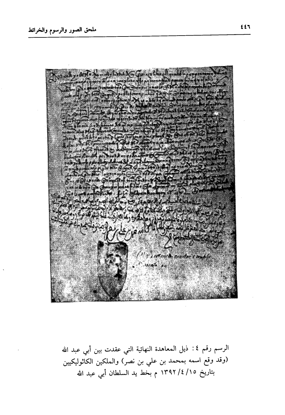 الرسم رقم 4: ذيل المعاهدة النهائية التي عقدت بين أبي عبد الله (وقد وقّع اسمه بمحمد بن علي بن نصر) والملكين الكاثوليكيين بتاريخ 15/ 4 / 1492 م بخط يد السلطان أبي عبد الله