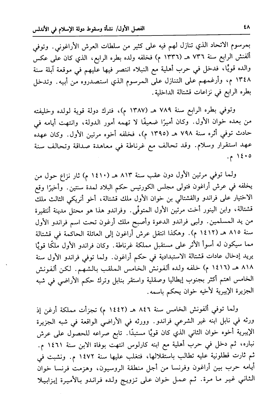ْولما توفي مرتين الأول دون عقب سنة 813 هـ (1410 م) ثار نزاع حول من يخلفه في عرش أراغون فتولى مجلس الكورتيس حكم البلاد لمدة سنتين. وأخيرًا وقع الاختيار على فراندو القشتالي بن خوان الأول ملك قشتالة، أخو أنريكي الثالث ملك قشتالة، وابن الينور أخت مرتين الأول المتوفى. وفراندو هذا هو محتل مدينة أنتقيرة من يد المسلمين. ولبى فراندو الدعوة وأصبح ملك أرغون تحت اسم فراندو الأول سنة 815 هـ (1412 م). وهكذا انتقل عرش أراغون إلى العائلة الحاكمة في قشتالة مما سيكون له أسوأ الأثر على مستقبل مملكة غرناطة. وكان فراندو الأول ملكًا قويًّا يريد إدخال عادات قشتالة الاستبدادية في حكم أراغون. ولما توفي فراندو الأول سنة 818 هـ (1416 م) خلفه ولده ألفونش الخامس الملقب بالشهم. لكن ألفونش الخامس اهتم أكثر بجنوب إيطاليا وصقلية واستقر بنابل وترك حكم الأراضي في شبه الجزيرة الإيبرية لأخيه خوان يحكم باسمه.