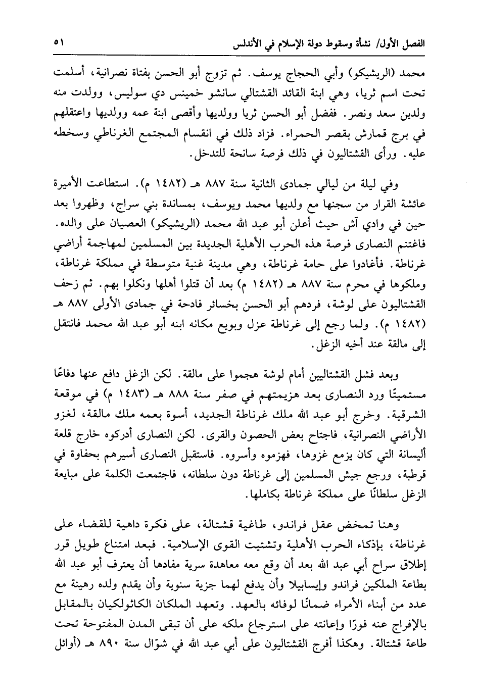 محمد (الريشيكو) وأبي الحجاج يوسف. ثم تزوج أبو الحسن بفتاة نصرانية، أسلمت تحت اسم ثريا، وهي ابنة القائد القشتالي سانشو خمينس دي سوليس، وولدت منه ولدين سعد ونصر. ففضل أبو الحسن ثريا وولديها وأقصى ابنة عمه وولديها واعتقلهم في برج قمارش بقصر الحمراء. فزاد ذلك في انقسام المجتمع الغرناطي وسخطه عليه. ورأى القشتاليون في ذلك فرصة سانحة للتدخل.