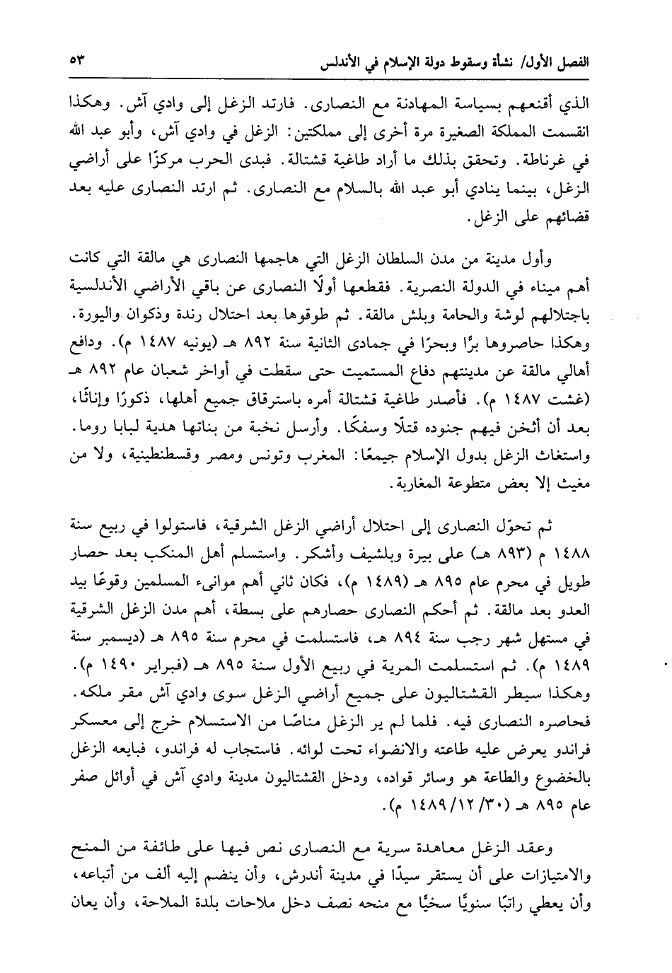 الذي أقنعهم بسياسة المهادنة مع النصارى. فارتد الزغل إلى وادي آش. وهكذا انقسمت المملكة الصغيرة مرة أخرى إلى مملكتين: الزغل في وادي آش، وأبو عبد الله في غرناطة. وتحقق بذلك ما أراد طاغية قشتالة. فبدء الحرب مركزًا على أراضي الزغل، بينما ينادي أبو عبد الله بالسلام مع النصارى. ثم ارتد النصارى عليه بعد قضائهم على الزغل.
