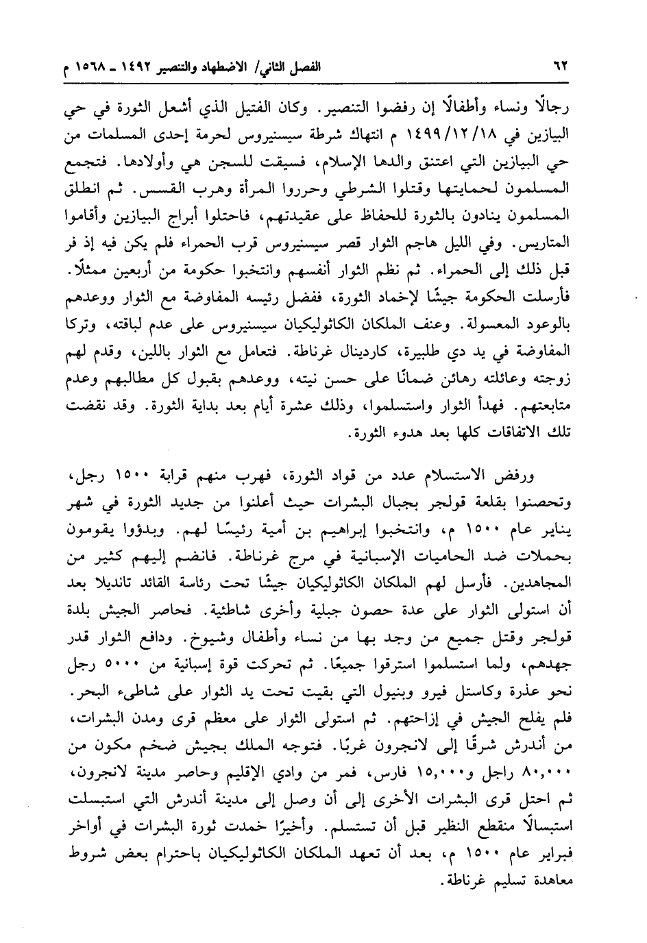 رجالاً ونساء وأطفالاً إن رفضوا التنصير. وكان الفتيل الذي أشعل الثورة في حي البيازين في 18/ 12 / 1499 م انتهاك شرطة سيسنيروس لحرمة إحدى المسلمات من حي البيازين التي اعتنق والدها الإسلام، فسيقت للسجن هي وأولادها. فتجمع المسلمون لحمايتها وقتلوا الشرطي وحرروا المرأة وهرب القسس. ثم انطلق المسلمون ينادون بالثورة للحفاظ على عقيدتهم، فاحتلوا أبراج البيازين وأقاموا المتاريس. وفي الليل هاجم الثوار قصر سيسنيروس قرب الحمراء فلم يكن فيه إذ فر قبل ذلك إلى الحمراء. ثم نظم الثوار أنفسهم وانتخبوا حكومة من أربعين ممثلاً.