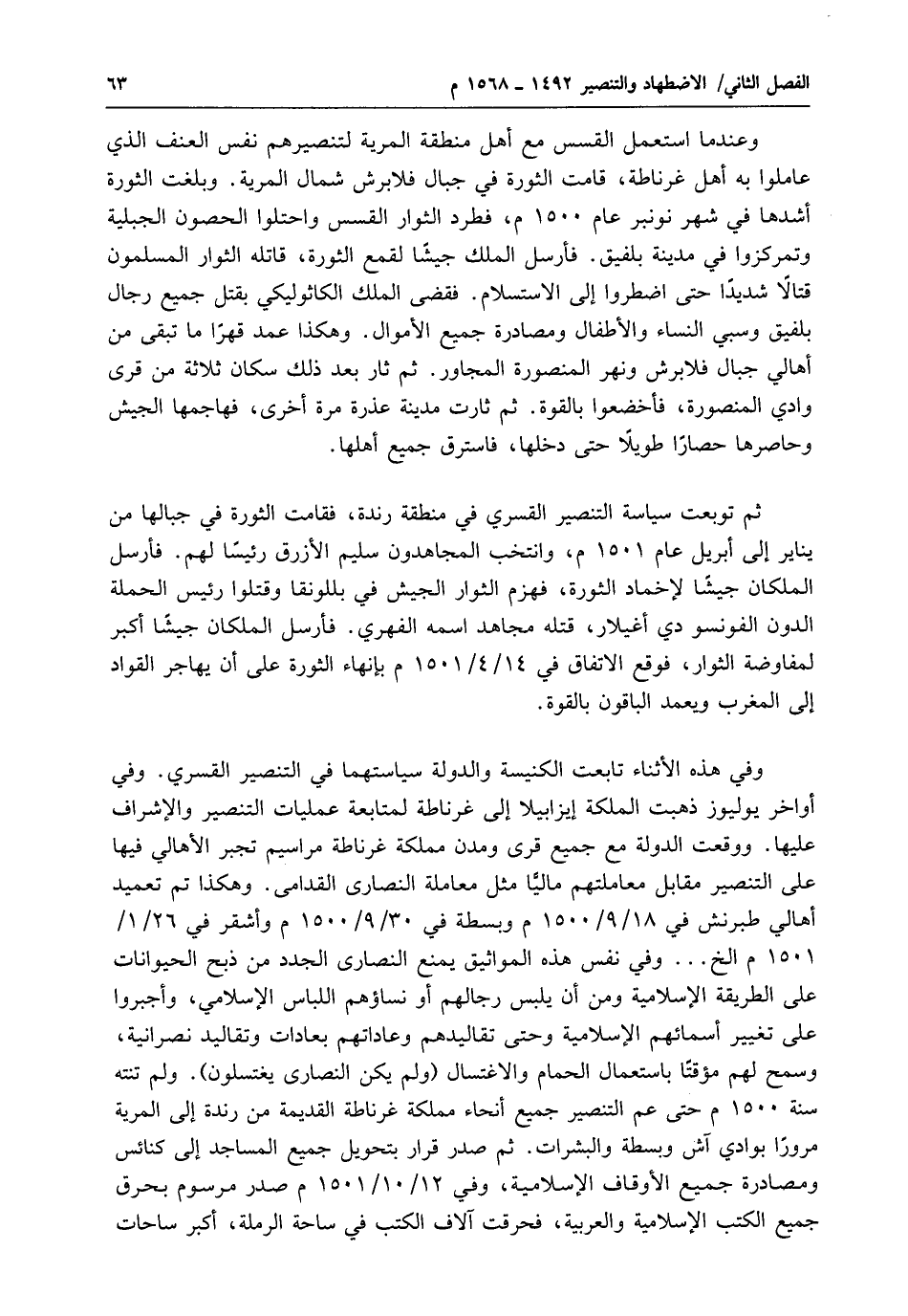 وفي هذه الأثناء تابعت الكنيسة والدولة سياستهما في التنصير القسري. وفي أواخر يوليوز ذهبت الملكة إيزابيلا إلى غرناطة لمتابعة عمليات التنصير والإشراف عليها. ووقعت الدولة مع جميع قرى ومدن مملكة غرناطة مراسيم تجبر الأهالي فيها على التنصير مقابل معاملتهم ماليَّا مثل معاملة النصارى القدامى. وهكذا تم تعميد أهالي طبرنش في 18/ 9 / 1500 م وبسطة في 30/ 9 / 1500 م وأشقر في 26/ 1 / 1501 م الخ ... وفي نفس هذه المواثيق يمنع النصارى الجدد من ذبح الحيوانات على الطريقة الإسلامية ومن أن يلبس رجالهم أو نساؤهم اللباس الإسلامي، وأجبروا على تغيير أسمائهم الإسلامية وحتى تقاليدهم وعاداتهم بعادات وتقاليد نصرانية، وسمح لهم مؤقتًا باستعمال الحمام والاغتسال (ولم يكن النصارى يغتسلون). ولم تنته سنة 1500 م حتى عم التنصير جميع أنحاء مملكة غرناطة القديمة من رندة إلى المرية مرورًا بوادي آش وبسطة والبشرات. ثم صدر قرار بتحويل جميع المساجد إلى كنائس ومصادرة جميع الأوقاف الإسلامية، وفي 12/ 10 / 1501 م صدر مرسوم بحرق جميع الكتب الإسلامية والعربية، فحرقت آلاف الكتب في ساحة الرملة، أكبر ساحات