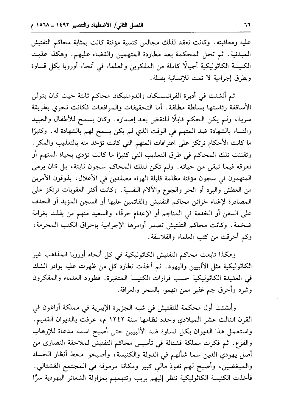 عليه ومعاقبته. وكانت تعقد لذلك مجالس كنسية مؤقتة كانت بمثابة محاكم التفتيش المبدئية. ثم تحل المحكمة بعد مطاردة المتهمين والقضاء عليهم. وهكذا عذبت الكنيسة الكاثوليكية أجيالاً كاملة من المفكرين والعلماء في أنحاء أوروبا بكل قساوة وبطرق إجرامية لا تمت للإنسانية بصلة.