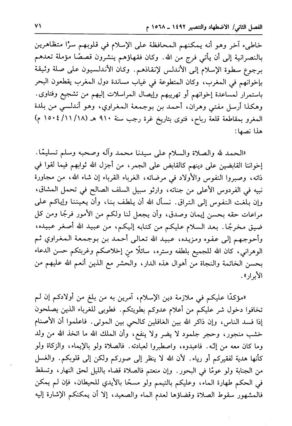 وهكذا أرسل مفتي وهران، أحمد بن بوجمعة المغراوي، وهو أندلسي من بلدة المغرو بمقاطعة قلعة رباح، فتوى بتاريخ غرة رجب سنة 910 هـ (18/ 11 / 1504 م) هذا نصها: " الحمد لله والصلاة والسلام على سيدنا محمد وآله وصحبه وسلم تسليمًا.