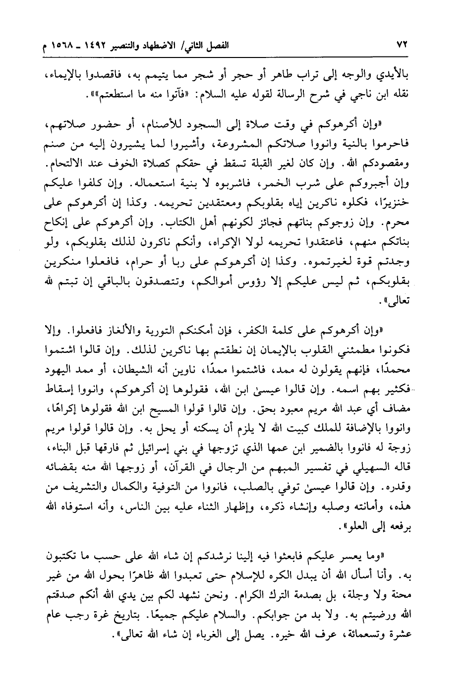 " وما يعسر عليكم فابعثوا فيه إلينا نرشدكم إن شاء الله على حسب ما تكتبون به. وأنا أسأل الله أن يبدل الكره للإسلام حتى تعبدوا الله ظاهرًا بحول الله من غير محنة ولا وجلة، بل بصدمة الترك الكرام. ونحن نشهد لكم بين يدي الله أنكم صدقتم الله ورضيتم به. ولا بد من جوابكم. والسلام عليكم جميعًا. بتاريخ غرة رجب عام عشرة وتسعمائة، عرف الله خيره. يصل إلى الغرباء إن شاء الله تعالى".