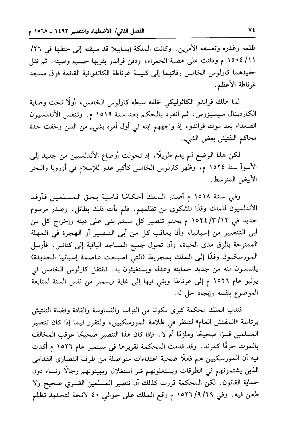 ظلمه وغدره وتعسفه الأمرين. وكانت الملكة إيسابيلا قد سبقته إلى حتفها في 26/ 11 / 1504 م ودفنت على هضبة الحمراء، ودفن فراندو بقربها حسب وصيته. ثم نقل حفيدهما كارلوس الخامس رفاتهما إلى كنيسة غرناطة الكاتدرائية القائمة فوق مسجد غرناطة الأعظم.