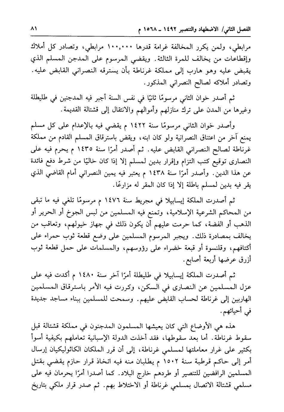 مرابطي، ولمن يكرر المخالفة غرامة قدرها 100.000 مرابطي، وتصادر كل أملاك وإقطاعات من يخالف للمرة الثالثة. ويقضي المرسوم على المدجن المسلم الذي يقبض عليه وهو هارب إلى مملكة غرناطة بأن يسترقه النصراني القابض عليه.