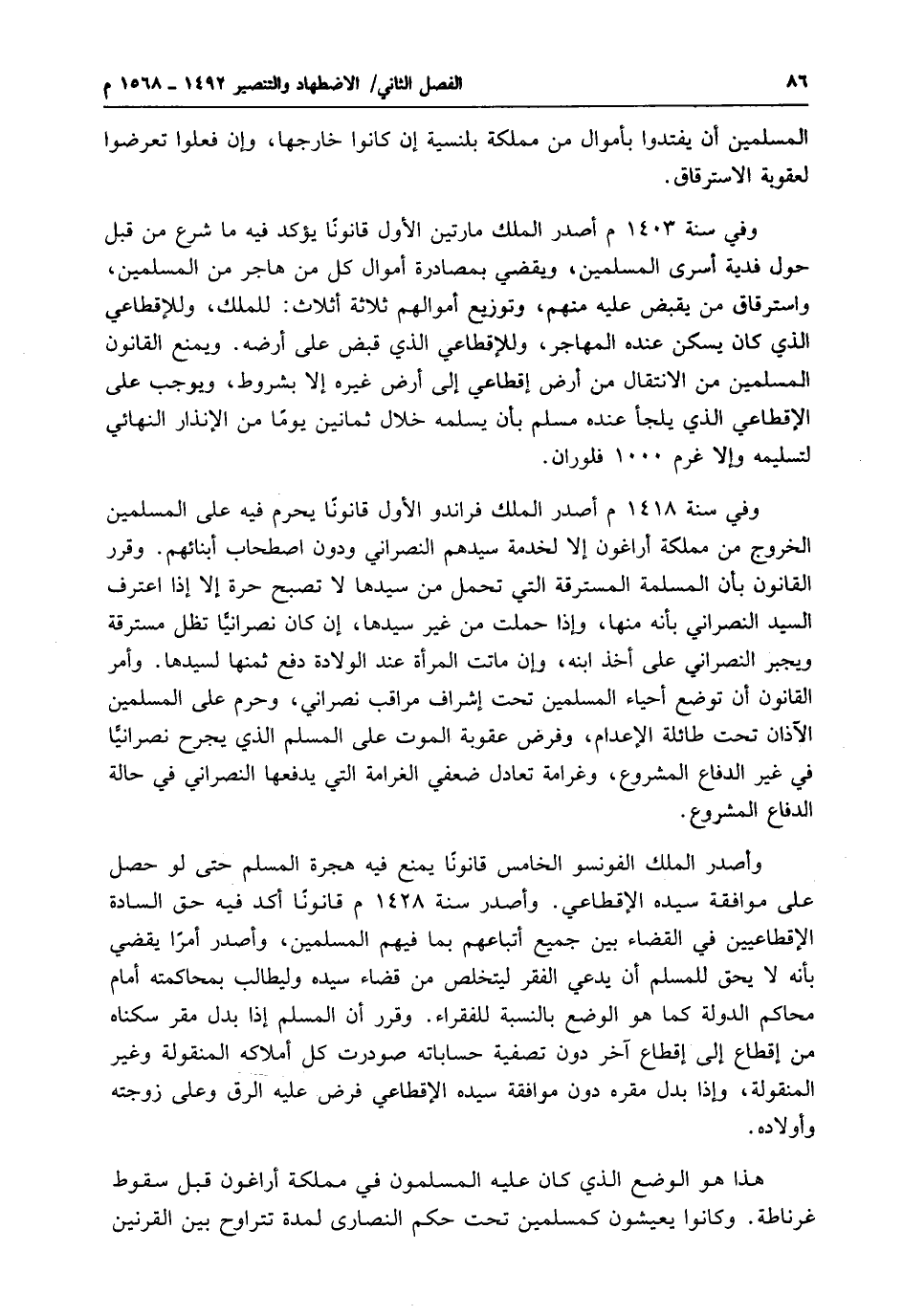 وأصدر الملك الفونسو الخامس قانونًا يمنع فيه هجرة المسلم حتى لو حصل على موافقة سيده الإقطاعي. وأصدر سنة 1428 م قانونًا أكد فيه حق السادة الإقطاعيين في القضاء بين جميع أتباعهم بما فيهم المسلمين، وأصدر أمرًا يقضي بأنه لا يحق للمسلم أن يدعي الفقر ليتخلص من قضاء سيده وليطالب بمحاكمته أمام محاكم الدولة كما هو الوضع بالنسبة للفقراء. وقرر أن المسلم إذا بدل مقر سكناه من إقطاع إلى إقطاع آخر دون تصفية حساباته صودرت كل أملاكه المنقولة وغير المنقولة، وإذا بدل مقره دون موافقة سيده الإقطاعي فرض عليه الرق وعلى زوجته وأولاده.