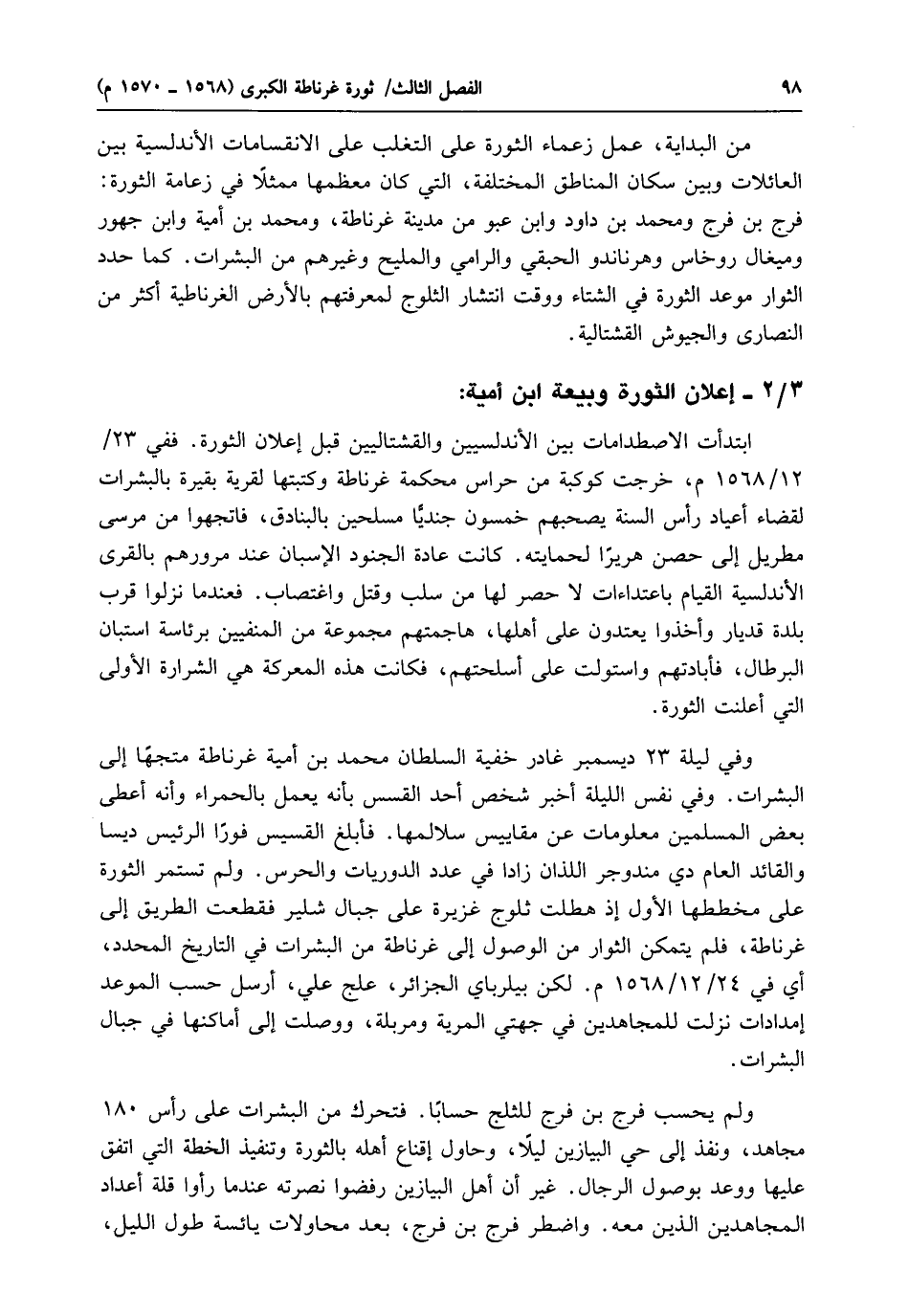 وفي ليلة 23 ديسمبر غادر خفية السلطان محمد بن أمية غرناطة متجهًا إلى البشرات. وفي نفس الليلة أخبر شخص أحد القسس بأنه يعمل بالحمراء وأنه أعطى بعض المسلمين معلومات عن مقاييس سلالمها. فأبلغ القسيس فورًا الرئيس ديسا والقائد العام دي مندوجر اللذان زادا في عدد الدوريات والحرس. ولم تستمر الثورة على مخططها الأول إذ هطلت ثلوج غزيرة على جبال شلير فقطعت الطريق إلى غرناطة، فلم يتمكن الثوار من الوصول إلى غرناطة من البشرات في التاريخ المحدد، أي في 24/ 12 / 1568 م. لكن بيلرباي الجزائر، علج علي، أرسل حسب الموعد إمدادات نزلت للمجاهدين في جهتي المرية ومربلة، ووصلت إلى أماكنها في جبال