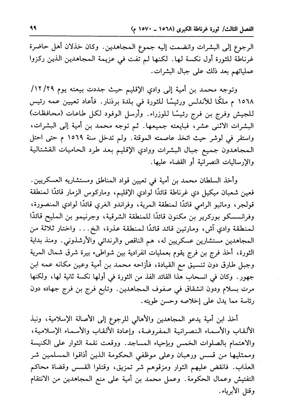 وتوجه محمد بن أمية إلى وادي الإقليم حيث جددت بيعته يوم 29/ 12 / 1568 م ملكًا للأندلس ورئيسًا للثورة في بلدة برذنار. فأعاد تعيين عمه رئيس للجيش وفرج بن فرج رئيسًا للوزراء. وأرسل الوفود لكل طاعات (محافظات) البشرات الاثنى عشر، فبايعته جميعها. ثم توجه محمد بن أمية إلى البشرات، واستقر في لوشر حيث اتخذ عاصمته الموقتة. ولم تدخل سنة 1569 م حتى احتل المجاهدون جميع جبال البشرات ووادي الإقليم بعد طرد الحاميات القشتالية والإرساليات النصرانية أو القضاء عليها.