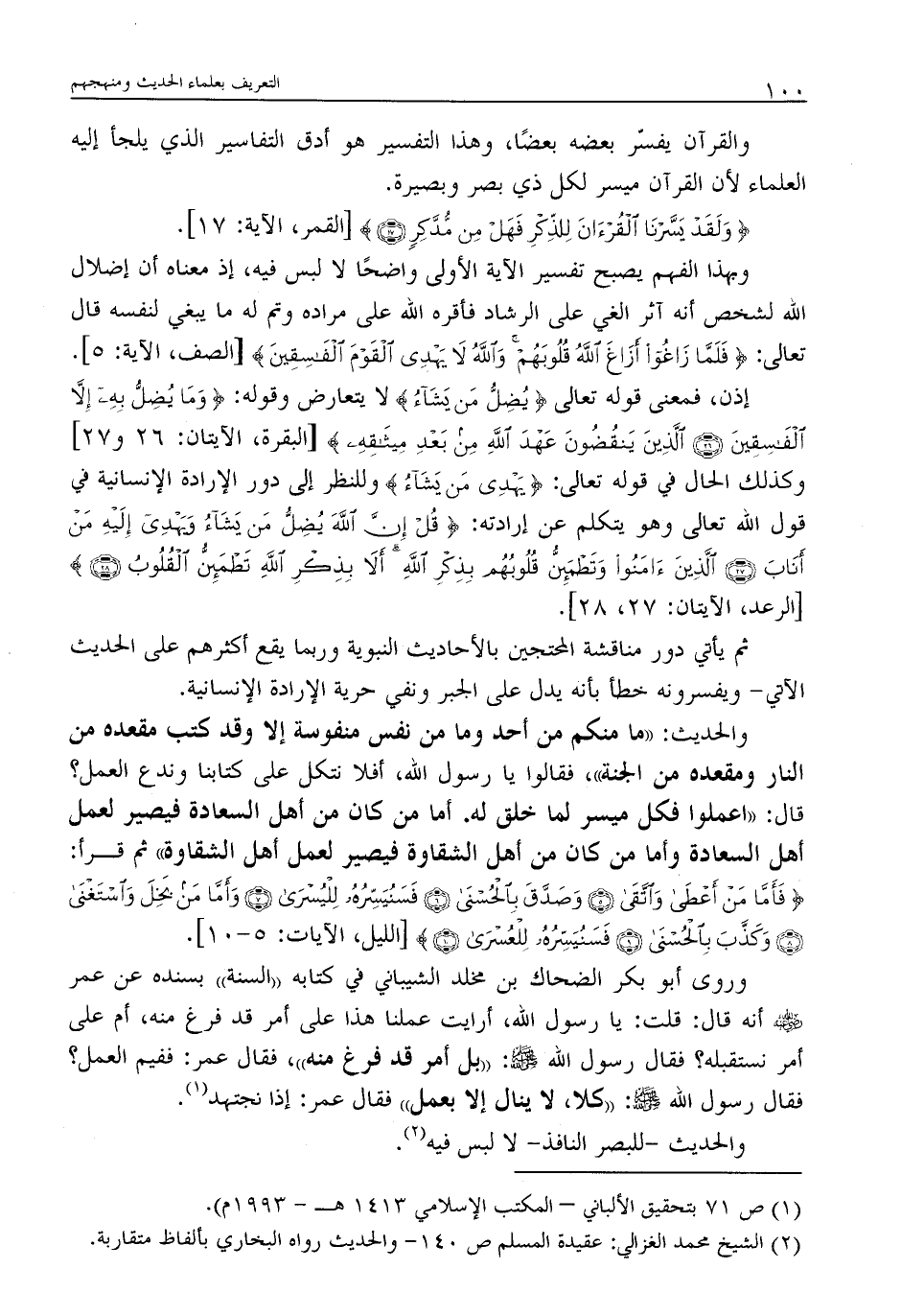ثم يأتي دور مناقشة المحتجين بالأحاديث النبوية وربما يقع أكثرهم على الحديث الآتي - ويفسرونه خطأ بأنه يدل على الجبر ونفي حرية الإرادة الإنسانية.
