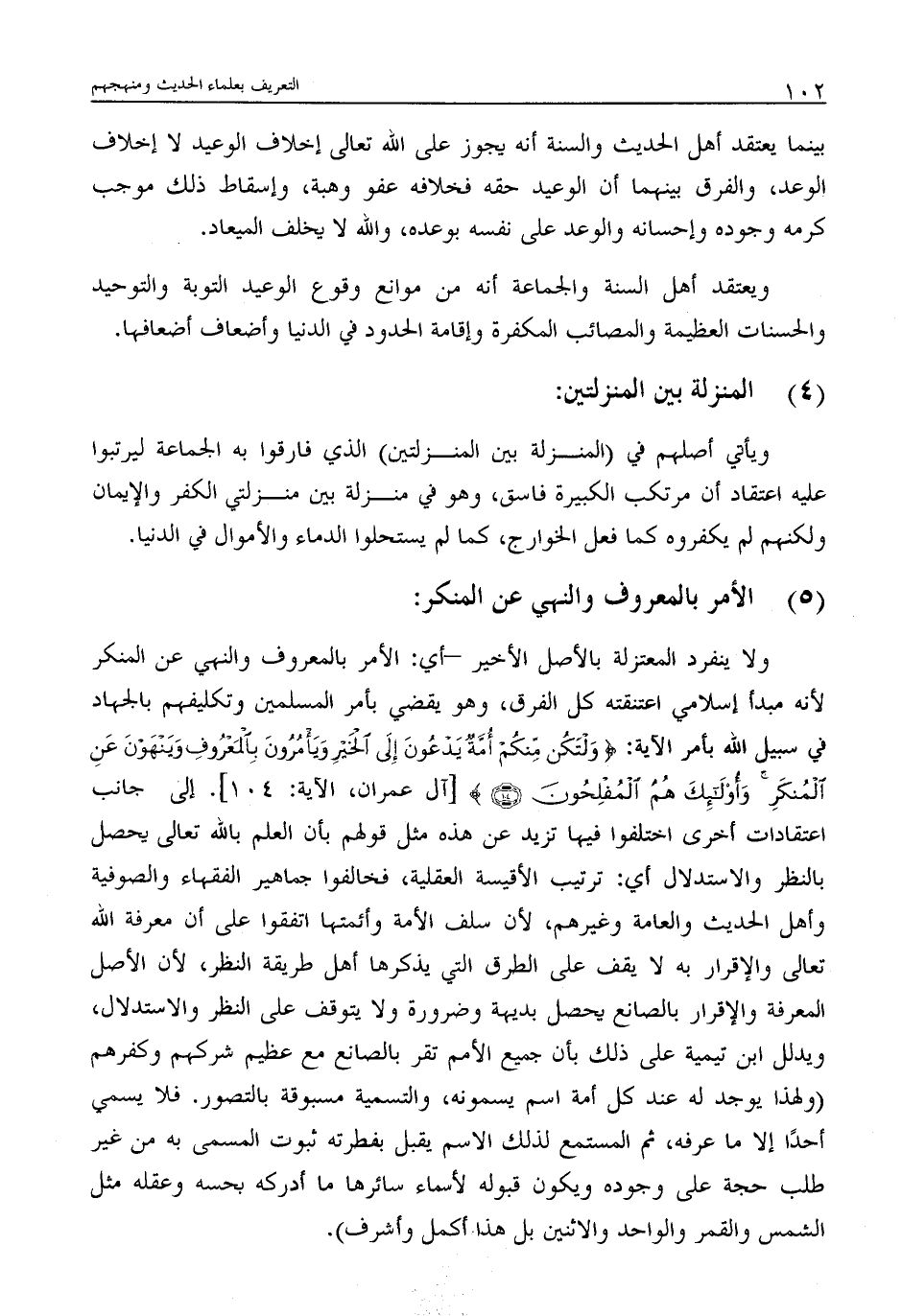 ولا ينفرد المعتزلة بالأصل الأخير - أي: الأمر بالمعروف والنهي عن المنكر لأنه مبدأ إسلامي اعتنقته كل الفرق، وهو يقضي بأمر المسلمين وتكليفهم بالجهاد في سبيل الله بأمر الآية: (وَلْتَكُنْ مِنْكُمْ أُمَّةٌ يَدْعُونَ إِلَى الْخَيْرِ وَيَأْمُرُونَ بِالْمَعْرُوفِ وَيَنْهَوْنَ عَنِ الْمُنْكَرِ وَأُولَئِكَ هُمُ الْمُفْلِحُونَ) [آل عمران، الآية: 104] . إلى جانب اعتقادات أخرى اختلفوا فيها تزيد عن هذه مثل قولهم بأن العلم بالله تعالى يحصل بالنظر والاستدلال أي: ترتيب الأقيسة العقلية، فخالفوا جماهير الفقهاء والصوفية وأهل الحديث والعامة وغيرهم، لأن سلف الأمة وأئمتها اتفقوا على أن معرفة الله تعالى والإقرار به لا يقف على الطرق التي يذكرها أهل طريقة النظر، لأن الأصل المعرفة والإقرار بالصانع يحصل بديهة وضرورة ولا يتوقف على النظر والاستدلال، ويدلل ابن تيمية على ذلك بأن جميع الأمم تقر بالصانع مع عظيم شركهم وكفرهم (ولهذا يوجد له عند كل أمة اسم يسمونه، والتسمية مسبوقة بالتصور. فلا يسمي أحدًا إلا ما عرفه، ثم المستمع لذلك الاسم يقبل بفطرته ثبوت المسمى به من غير طلب حجة على وجوده ويكون قبوله لأسماء سائرها ما أدركه بحسه وعقله مثل الشمس والقمر والواحد والاثنين بل هذا أكمل وأشرف) .