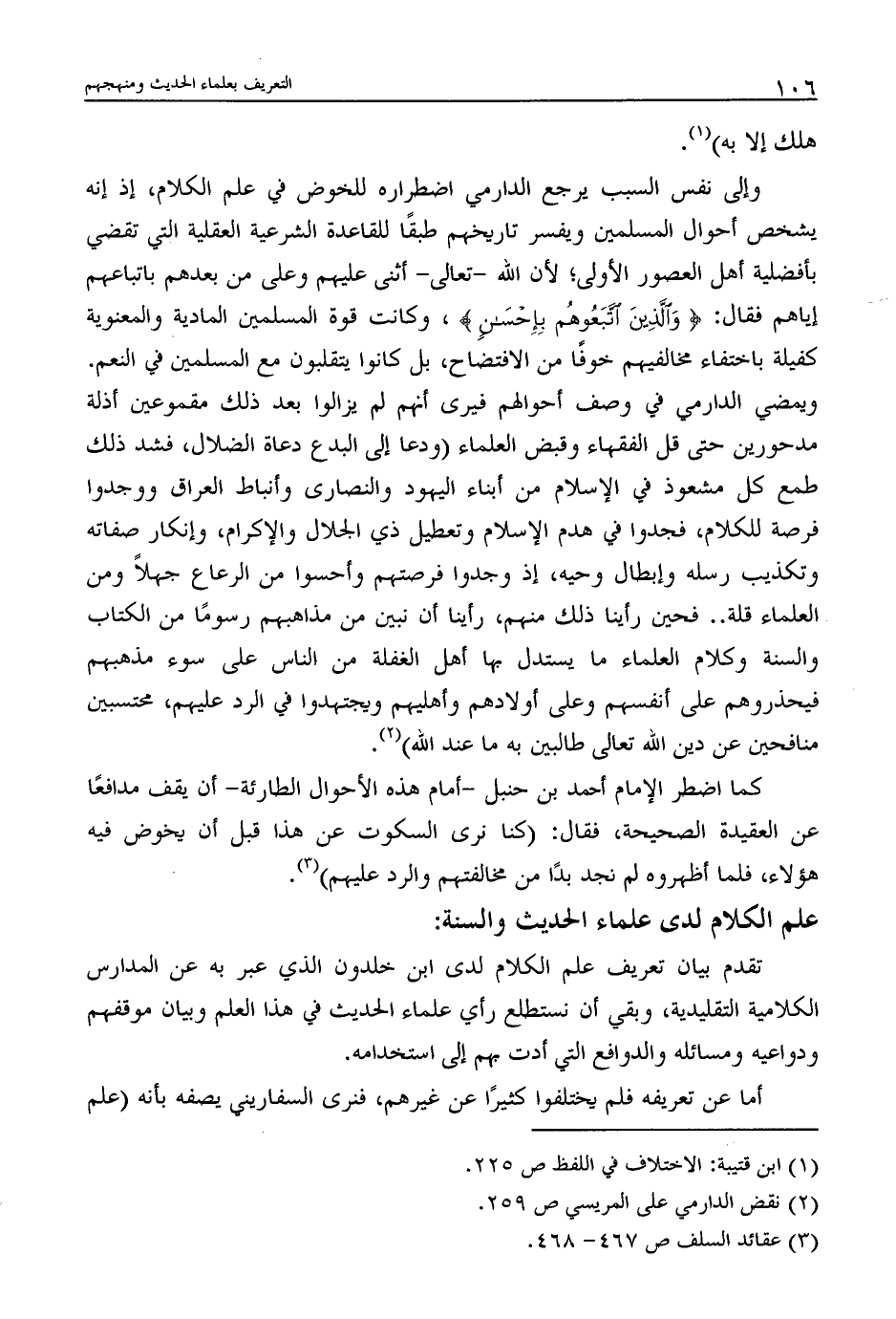 وإلى نفس السبب يرجع الدارمي اضطراره للخوض في علم الكلام، إذ إنه يشخص أحوال المسلمين ويفسر تاريخهم طبقًا للقاعدة الشرعية العقلية التي تقضي بأفضلية أهل العصور الأولى، لأن الله - تعالى - أثنى عليهم وعلى من بعدهم باتباعهم إياهم فقال: (وَالَّذِينَ اتَّبَعُوهُمْ بِإِحْسَانٍ) ، وكانت قوة المسلمين المادية والمعنوية كفيلة باختفاء مخالفيهم خوفًا من الافتضاح، بل كانوا يتقلبون مع المسلمين في النعم. ويمضي الدارمي في وصف أحوالهم فيرى أنهم لم يزالوا بعد ذلك مقموعين أذلة مدحورين حتى قل الفقهاء وقبض العلماء (ودعا إلى البدع دعاة الضلال، فشد ذلك طمع كل مشعوذ في الإسلام من أبناء اليهود والنصارى وأنباط العراق ووجدوا فرصة للكلام، فجدوا في هدم الإسلام وتعطيل ذي الجلال والإكرام، وإنكار صفاته وتكذيب رسله وإبطال وحيه، إذ وجدوا فرصتهم وأحسوا من الرعاع جهلاً ومن العلماء قلة.. فحين رأينا ذلك منهم، رأينا أن نبين من مذاهبهم رسومًا من الكتاب والسنة وكلام العلماء ما يستدل بها أهل الغفلة من الناس على سوء مذهبهم فيحذروهم على أنفسهم وعلى أولادهم وأهليهم ويجتهدوا في الرد عليهم، محتسبين منافحين عن دين الله تعالى طالبين به ما عند الله) (2) .