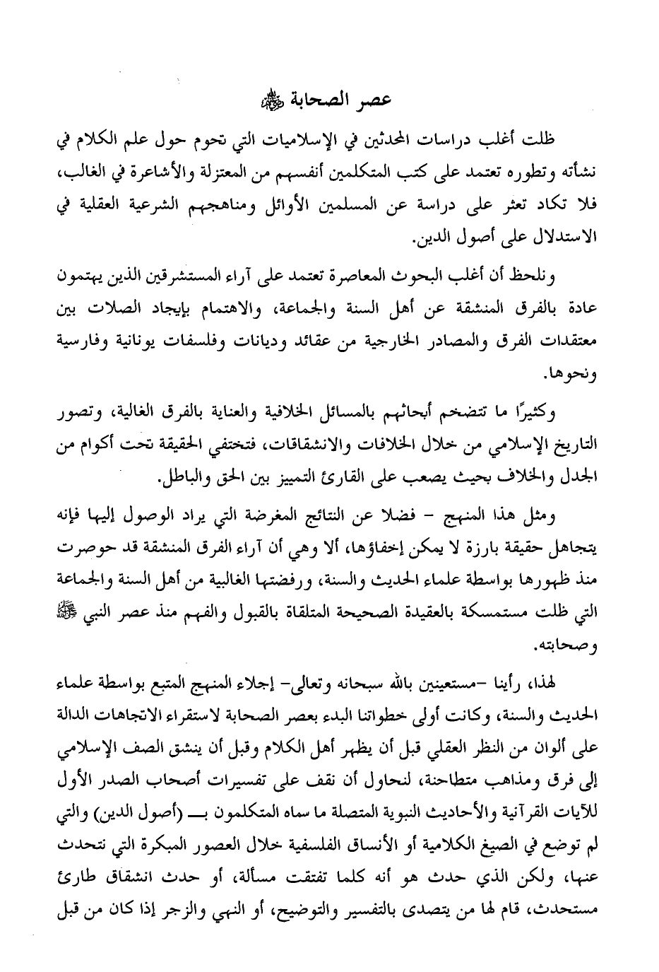 لهذا، رأينا - مستعينين بالله سبحانه وتعالى - إجلاء المنهج المتبع بواسطة علماء الحديث والسنة، وكانت أولى خطواتنا البدء بعصر الصحابة لاستقراء الاتجاهات الدالة على ألوان من النظر العقلي قبل أن يظهر أهل الكلام وقبل أن ينشق الصف الإسلامي إلى فرق ومذاهب متطاحنة، لنحاول أن نقف على تفسيرات أصحاب الصدر الأول للآيات القرآنية والأحاديث النبوية المتصلة ما سماه المتكلمون بـ (أصول الدين) والتي لم توضع في الصيغ الكلامية أو الأنساق الفلسفية خلال العصور المبكرة التي نتحدث عنها، ولكن الذي حدث هو أنه كلما تفتقت مسألة، أو حدث انشقاق طارئ مستحدث، قام لها من يتصدى بالتفسير والتوضيح، أو النهي والزجر إذا كان من قبل