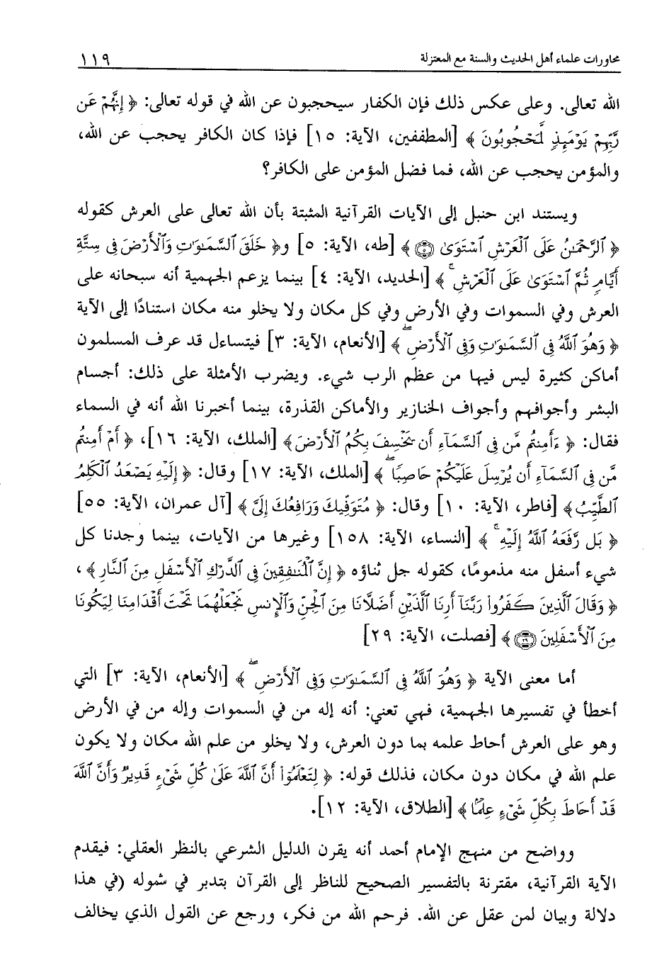 ويستند ابن حنبل إلى الآيات القرآنية المثبتة بأن الله تعالى على العرش كقوله (الرَّحْمَنُ عَلَى الْعَرْشِ اسْتَوَى) [طه، الآية: 5] و (خَلَقَ السَّمَاوَاتِ وَالْأَرْضَ فِي سِتَّةِ أَيَّامٍ ثُمَّ اسْتَوَى عَلَى الْعَرْشِ) [الحديد، الآية: 4] بينما يزعم الجهمية أنه سبحانه على العرش وفي السموات وفي الأرض وفي كل مكان ولا يخلو منه مكان استنادًا إلى الآية (وَهُوَ اللَّهُ فِي السَّمَاوَاتِ وَفِي الْأَرْضِ) [الأنعام، الآية: 3] فيتساءل قد عرف المسلمون أماكن كثيرة ليس فيها من عظم الرب شيء. ويضرب الأمثلة على ذلك: أجسام البشر وأجوافهم وأجواف الخنازير والأماكن القذرة، بينما أخبرنا الله أنه في السماء فقال: (ءَأَمِنْتُمْ مَنْ فِي السَّمَاءِ أَنْ يَخْسِفَ بِكُمُ الْأَرْضَ) [الملك، الآية: 16] ، (أَمْ أَمِنْتُمْ مَنْ فِي السَّمَاءِ أَنْ يُرْسِلَ عَلَيْكُمْ حَاصِبًا) [الملك: 17] وقال: (إِلَيْهِ يَصْعَدُ الْكَلِمُ الطَّيِّبُ) [فاطر، الآية: 10] وقال: (مُتَوَفِّيكَ وَرَافِعُكَ إِلَيَّ) [آل عمران، الآية: 55] (بَلْ رَفَعَهُ اللَّهُ إِلَيْهِ) [النساء، الآية: 158] وغيرها من الآيات، بينما وجدنا كل شيء أسفل منه مذمومًا، كقوله جل ثناؤه (إِنَّ الْمُنَافِقِينَ فِي الدَّرْكِ الْأَسْفَلِ مِنَ النَّارِ) ، (قَالَ الَّذِينَ كَفَرُوا رَبَّنَا أَرِنَا اللَّذَيْنِ أَضَلَّانَا مِنَ الْجِنِّ وَالْإِنْسِ نَجْعَلْهُمَا تَحْتَ أَقْدَامِنَا لِيَكُونَا مِنَ الْأَسْفَلِينَ) [فصلت، الآية: 29]