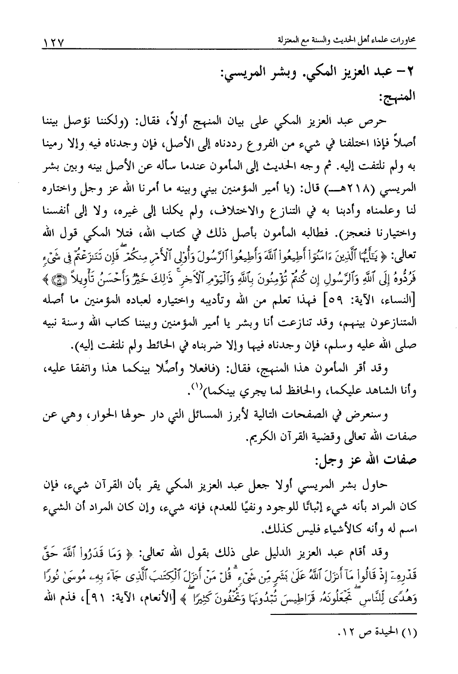 وسنعرض في الصفحات التالية لأبرز المسائل التي دار حولها الحوار، وهي عن صفات الله تعالى وقضية القرآن الكريم.