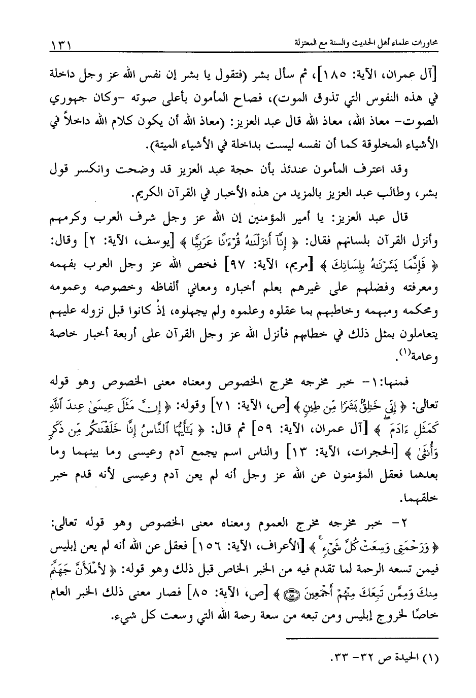 [آل عمران، الآية: 185] ، ثم سأل بشر (فتقول يا بشر إن نفس الله عز وجل داخلة في هذه النفوس التي تذوق الموت) ، فصاح المأمون بأعلى صوته - وكان جهوري الصوت - معاذ الله، معاذ الله قال عبد العزيز: (معاذ الله أن يكون كلام الله داخلاً في الأشياء المخلوقة كما أن نفسه ليست بداخلة في الأشياء الميتة) .