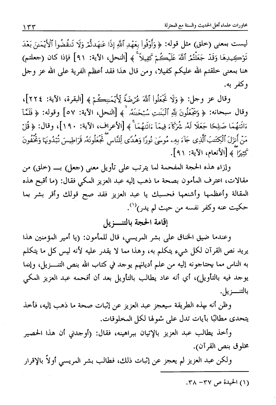 وإزاء هذه الحجة المفحمة لما يترتب على تأويل معنى (جعل) بـ (خلق) من مقالات، اعترف المأمون بصحة ما ذهب إليه عبد العزيز المكي فقال: (ما أقبح هذه المقالة وأعظمها وأشنعها فحسبك يا عبد العزيز فقد صح قولك وأقر بشر بما حكيت عنه وكفر نفسه من حيث لم يدر) (1) .