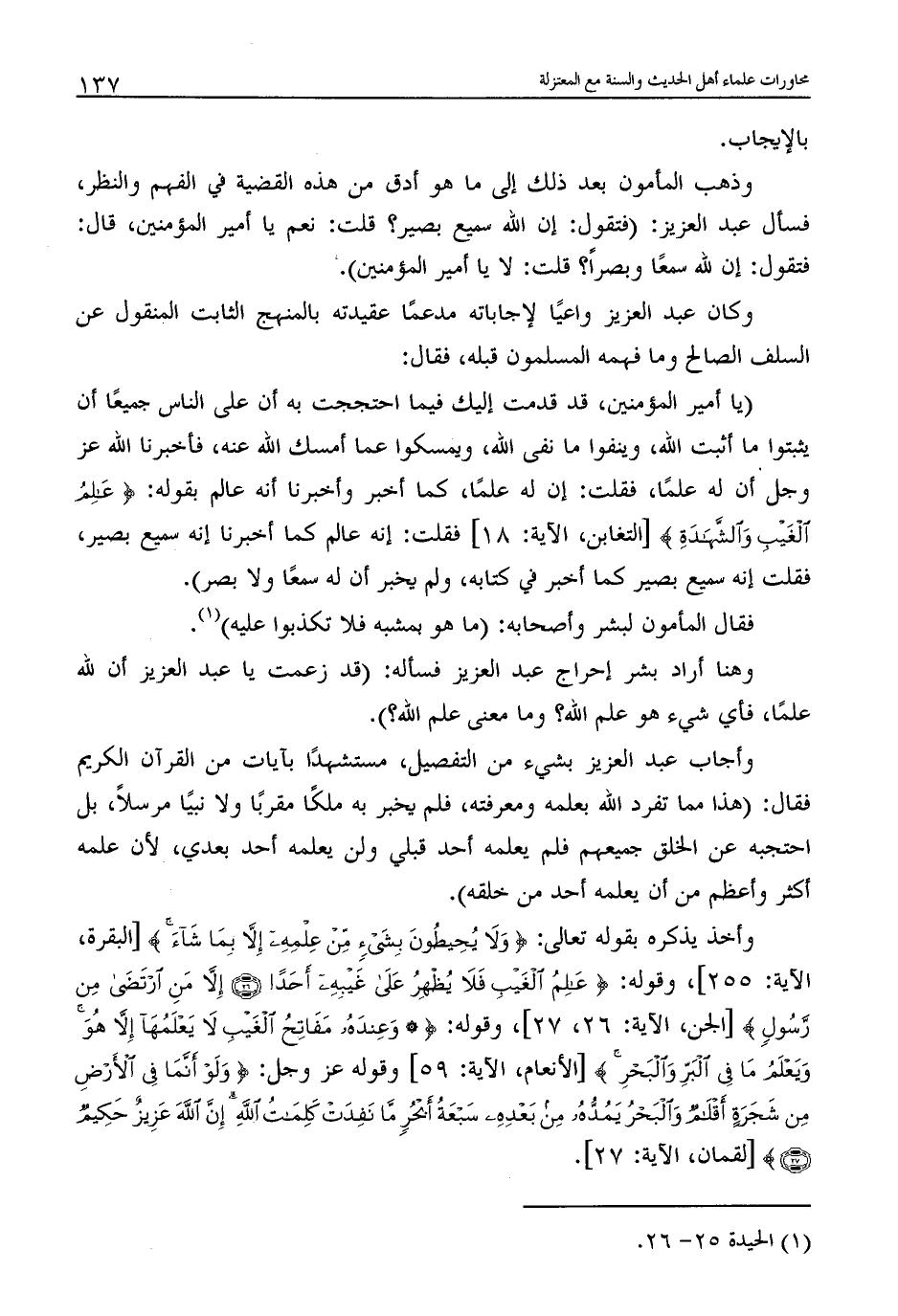 فقال المأمون لبشر وأصحابه: (ما هو بمشبه فلا تكذبوا عليه) (1) . وهنا أراد بشر إحراج عبد العزيز فسأله: (قد زعمت يا عبد العزيز أن لله علمًا، فأي شيء هو علم الله؟ وما معنى علم الله؟) .