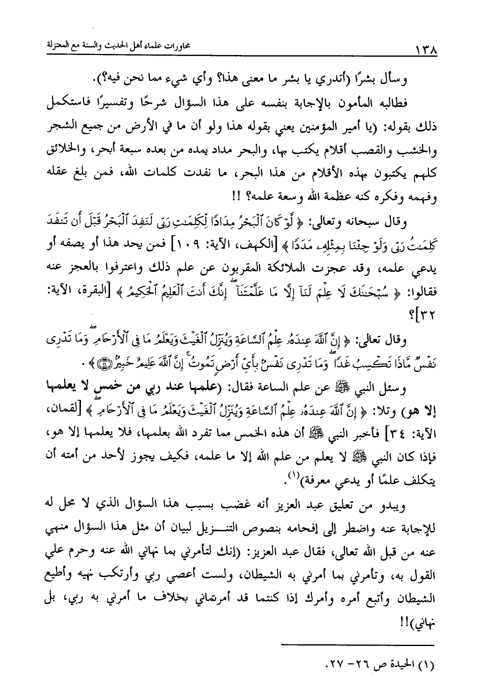 وسأل بشرًا (أتدري يا بشر ما معنى هذا؟ وأي شيء مما نحن فيه؟) . فطالبه المأمون بالإجابة بنفسه على هذا السؤال شرحًا وتفسيرًا فاستكمل ذلك بقوله: (يا أمير المؤمنين يعني بقوله هذا ولو أن ما في الأرض من جميع الشجر والخشب والقصب أقلام يكتب بها، والبحر مداد يمده من بعده سبعة أبحر، والخلائق كلهم يكتبون بهذه الأقلام من هذا البحر، ما نفدت كلمات الله، فمن بلغ عقله وفهمه وفكره كنه عظمة الله وسعة علمه؟!!