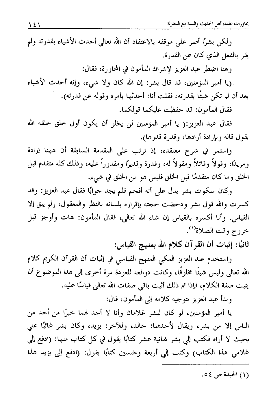 فقال عبد العزيز: (يا أمير المؤمنين لن يخلو أن يكون أول خلق خلقه الله بقول قاله وبإرادة أرادها، وقدرة قدرها) .