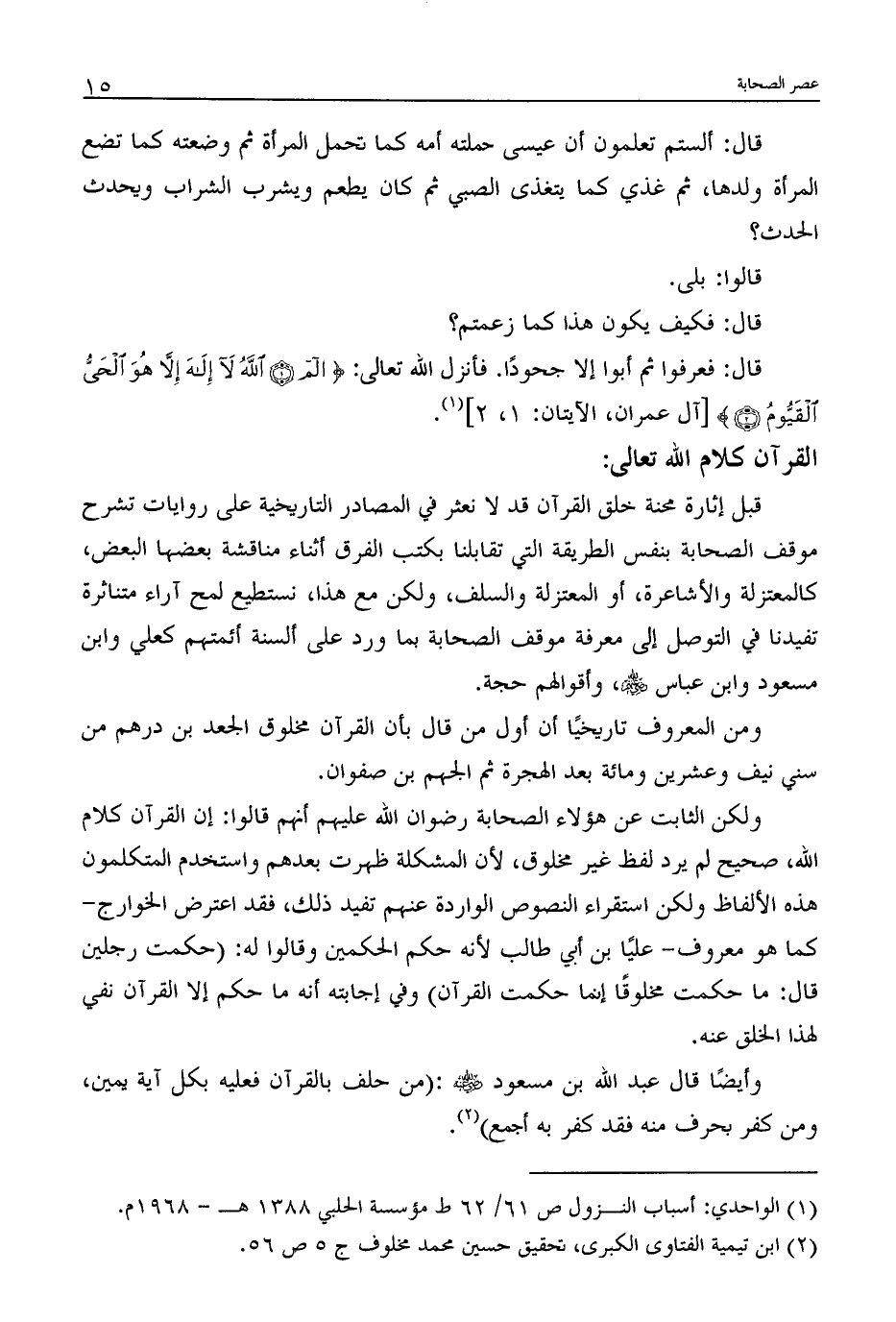 ولكن الثابت عن هؤلاء الصحابة رضوان الله عليهم أنهم قالوا: إن القرآن كلام الله، صحيح لم يرد لفظ غير مخلوق، لأن المشكلة ظهرت بعدهم واستخدم المتكلمون هذه الألفاظ ولكن استقراء النصوص الواردة عنهم تفيد ذلك، فقد اعترض الخوارج - كما هو معروف - عليًا بن أبي طالب لأنه حكم الحكمين وقالوا له: (حكمت رجلين قال: ما حكمت مخلوقًا إنما حكمت القرآن) وفي إجابته أنه ما حكم إلا القرآن نفي لهذا الخلق عنه.