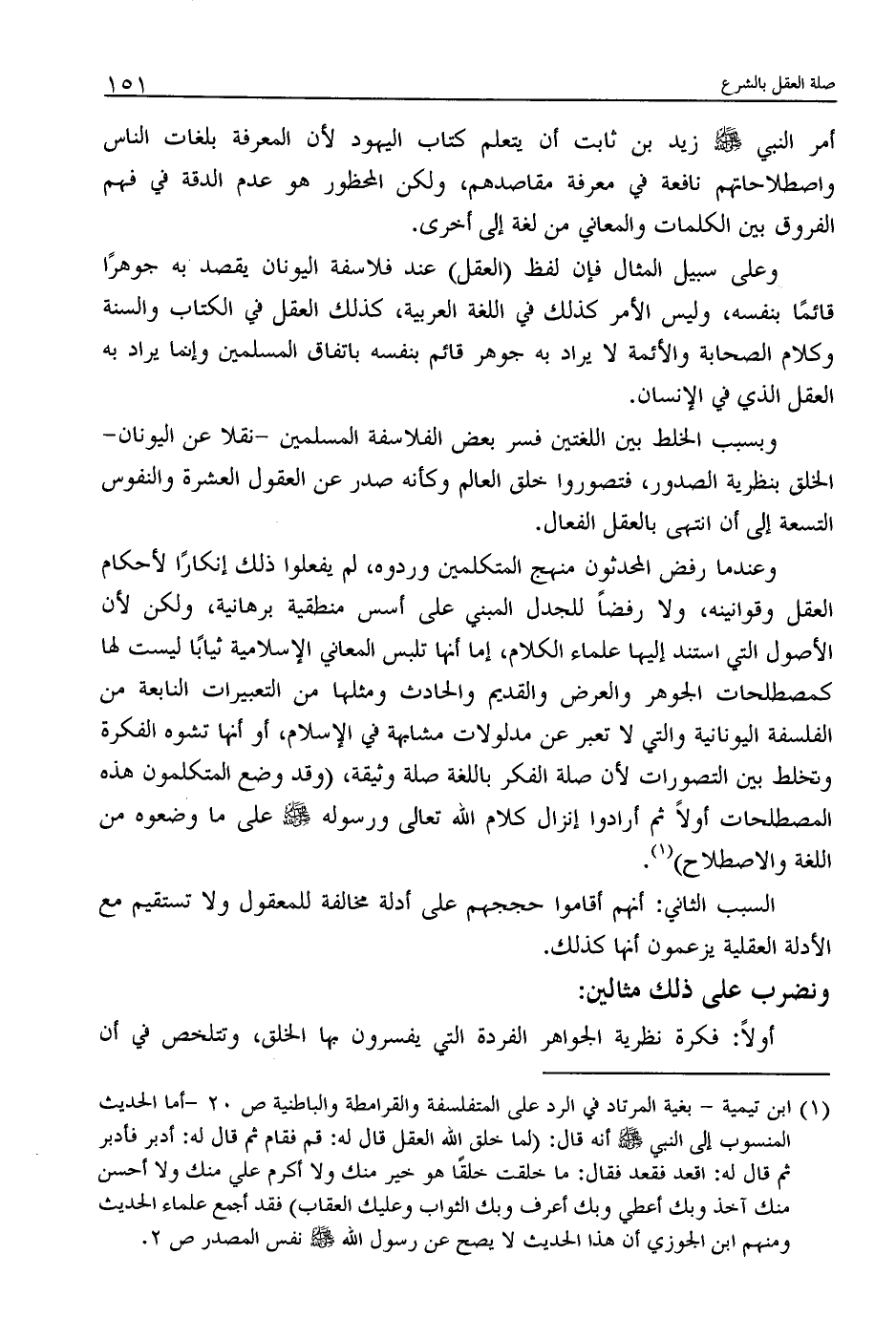 (1) ابن تيمية - بغية المرتاد في الرد على المتفلسفة والقرامطة والباطنية ص 20- أما الحديث المنسوب إلى النبي - صلى الله عليه وسلم - أنه قال: (لما خلق الله العقل قال له: قم فقام ثم قال له: أدبر فأدبر ثم قال له: اقعد فقعد فقال: ما خلقت خلقًا هو خير منك ولا أكرم علي منك ولا أحسن منك آخذ وبك أعطي وبك أعرف وبك الثواب وعليك العقاب) فقد أجمع علماء الحديث ومنهم ابن الجوزي أن هذا الحديث لا يصح عن رسول الله - صلى الله عليه وسلم - نفس المصدر ص 2.