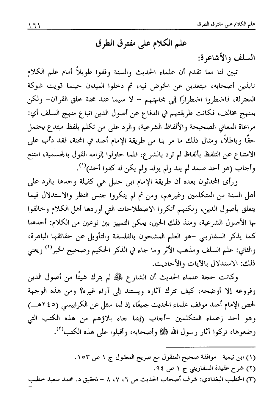 ورأى المحدثون بعده أن طريقة الإمام ابن حنبل هي كفيلة وحدها بالرد على أهل السنة من المتكلمين وغيرهم، ومن ثم لم ينكروا جنس النظر والاستدلال فيما يتعلق بأصول الدين، ولكنهم أنكروا الاصطلاحات التي أوردها أهل الكلام وخالفوا بها الأصول الشرعية، ومنذ ذلك الحين، يمكن التمييز بين نوعين من الكلام: أحدهما كما يذكر السفاريني - هو العلم المشحون بالفلسفة والتأويل عن حقائقها الباهرة، والثاني: علم السلف ومذهب الأثر وما جاء في الذكر الحكيم وصحيح الخبر (2) ويعني ذلك: الاستدلال بالآيات والأحاديث.