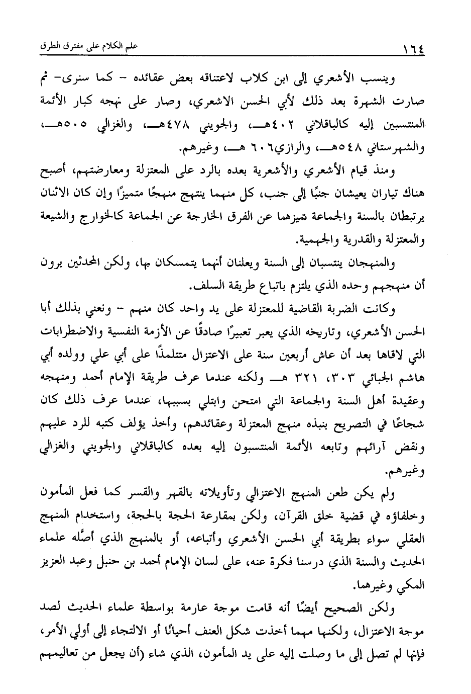 ولم يكن طعن المنهج الاعتزالي وتأويلاته بالقهر والقسر كما فعل المأمون وخلفاؤه في قضية خلق القرآن، ولكن بمقارعة الحجة بالحجة، واستخدام المنهج العقلي سواء بطريقة أبي الحسن الأشعري وأتباعه، أو بالمنهج الذي أضله علماء الحديث والسنة الذي درسنا فكرة عنه، على لسان الإمام أحمد بن حنبل وعبد العزيز المكي وغيرهما.