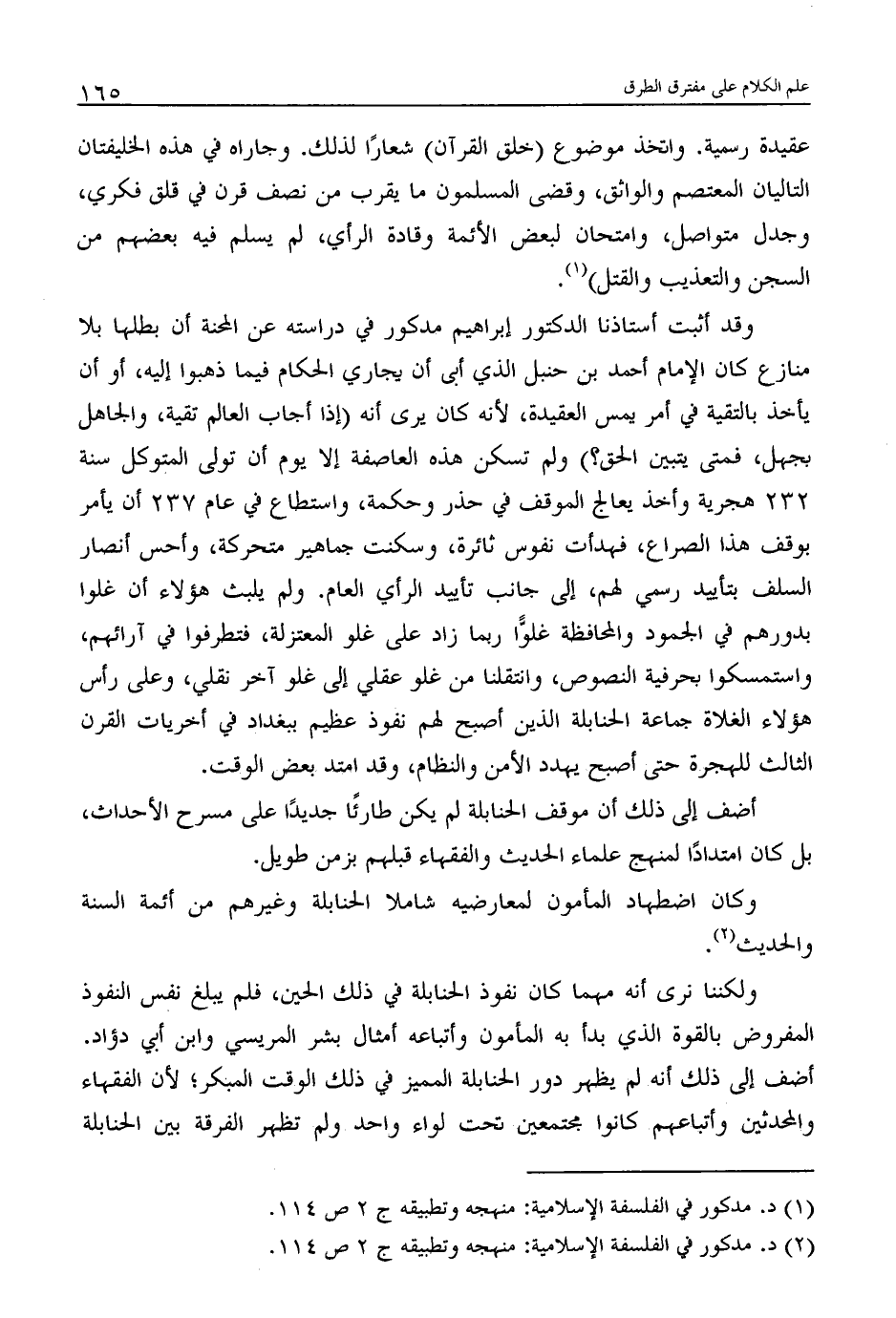 وقد أثبت أستاذنا الدكتور إبراهيم مدكور في دراسته عن المحنة أن بطلها بلا منازع كان الإمام أحمد بن حنبل الذي أبى أن يجاري الحكام فيما ذهبوا إليه، أو أن يأخذ بالتقية في أمر يمس العقيدة، لأنه كان يرى أنه (إذا أجاب العالم تقية، والجاهل بجهل، فمتى يتبين الحق؟) ولم تسكن هذه العاصفة إلا يوم أن تولى المتوكل سنة 232 هجرية وأخذ يعالج الموقف في حذر وحكمة، واستطاع في عام 237 أن يأمر بوقف هذا الصراع، فهدأت نفوس ثائرة، وسكنت جماهير متحركة، وأحس أنصار السلف بتأييد رسمي لهم، إلى جانب تأييد الرأي العام. ولم يلبث هؤلاء أن غلوا بدورهم في الجمود والمحافظة غلوًّا ربما زاد على غلو المعتزلة، فتطرفوا في آرائهم، واستمسكوا بحرفية النصوص، وانتقلنا من غلو عقلي إلى غلو آخر نقلي، وعلى رأس هؤلاء الغلاة جماعة الحنابلة الذين أصبح لهم نفوذ عظيم ببغداد في أخريات القرن الثالث للهجرة حتى أصبح يهدد الأمن والنظام، وقد امتد بعض الوقت.