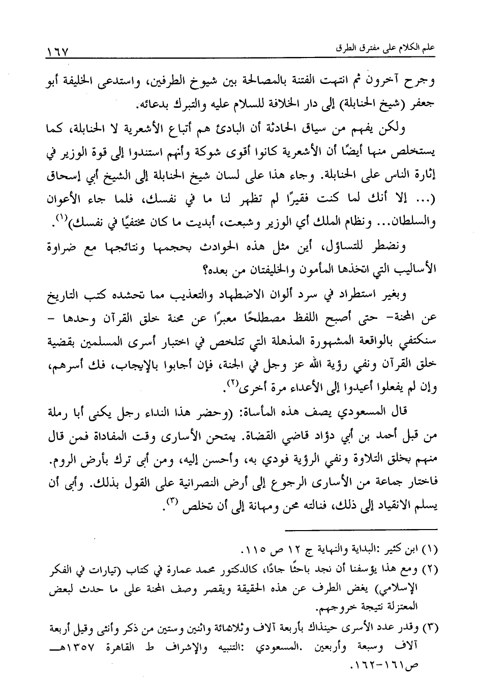 (2) ومع هذا يؤسفنا أن نجد باحثاً جادًا، كالدكتور محمد عمارة في كتاب (تيارات في الفكر الإسلامي) يغض الطرف عن هذه الحقيقة ويقصر وصف المحنة على ما حدث لبعض المعتزلة نتيجة خروجهم.