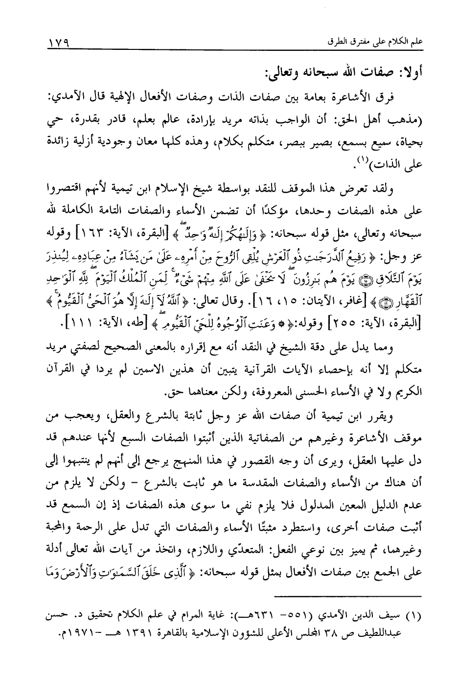 (1) سيف الدين الآمدي (551 - 631 هـ) : غاية المرام في علم الكلام تحقيق د. حسن عبد اللطيف ص 38 المجلس الأعلى للشؤون الإسلامية بالقاهرة 1391 هـ - 1971 م.