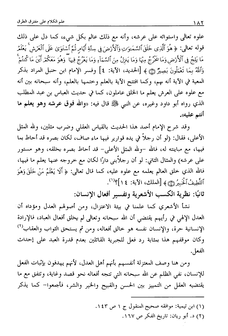 علوه تعالى واستوائه على عرشه، وأنه مع ذلك عالم بكل شيء، كما دل على ذلك قوله تعالى: (هُوَ الَّذِي خَلَقَ السَّمَاوَاتِ وَالْأَرْضَ فِي سِتَّةِ أَيَّامٍ ثُمَّ اسْتَوَى عَلَى الْعَرْشِ يَعْلَمُ مَا يَلِجُ فِي الْأَرْضِ وَمَا يَخْرُجُ مِنْهَا وَمَا يَنْزِلُ مِنَ السَّمَاءِ وَمَا يَعْرُجُ فِيهَا وَهُوَ مَعَكُمْ أَيْنَ مَا كُنْتُمْ وَاللَّهُ بِمَا تَعْمَلُونَ بَصِيرٌ) [الحديد، الآية: 4] وفسر الإمام ابن حنبل المراد بذكر المعية في الآية أنه بهم، وكما افتتح الآية بالعلم وختمها بالعلم، وأنه سبحانه بين أنه مع علوه على العرش يعلم ما الخلق عاملون، كما في حديث العباس بن عبد المطلب الذي رواه أبو داود وغيره، عن النبي - صلى الله عليه وسلم - قال فيه: "والله فوق عرشه وهو يعلم ما أنتم عليه".