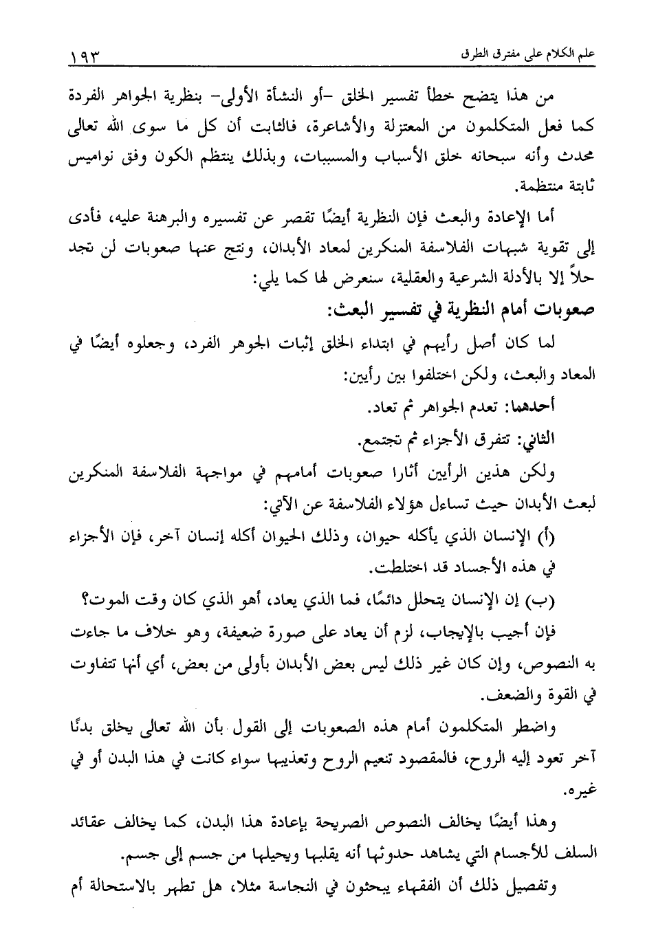 (ب) إن الإنسان يتحلل دائمًا، فما الذي يعاد، أهو الذي كان وقت الموت؟ فإن أجيب بالإيجاب، لزم أن يعاد على صورة ضعيفة، وهو خلاف ما جاءت به النصوص، وإن كان غير ذلك ليس بعض الأبدان بأولى من بعض، أي أنها تتفاوت في القوة والضعف.