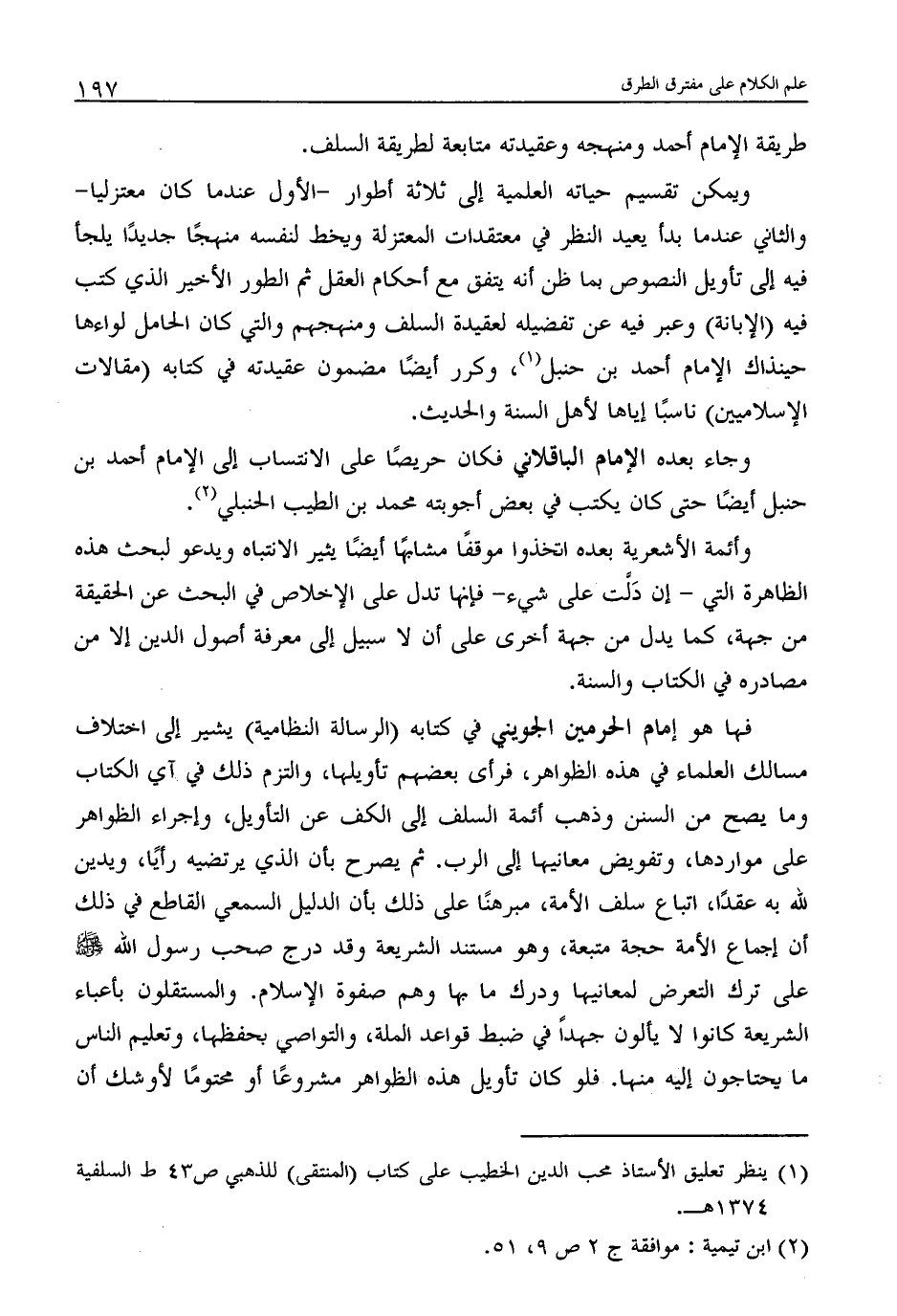 فها هو إمام الحرمين الجويني في كتابه (الرسالة النظامية) يشير إلى اختلاف مسالك العلماء في هذه الظواهر، فرأى بعضهم تأويلها، والتزم ذلك في آي الكتاب وما يصح من السنن وذهب أئمة السلف إلى الكف عن التأويل، وإجراء الظواهر على مواردها، وتفويض معانيها إلى الرب. ثم يصرح بأن الذي يرتضيه رأيًا، ويدين لله به عقدًا، اتباع سلف الأمة، مبرهنًا على ذلك بأن الدليل السمعي القاطع في ذلك أن إجماع الأمة حجة متبعة، وهو مستند الشريعة وقد درج صحب رسول الله - صلى الله عليه وسلم - على ترك التعرض لمعانيها ودرك ما بها وهم صفوة الإسلام. والمستقلون بأعباء الشريعة كانوا لا يألون جهداً في ضبط قواعد الملة، والتواصي بحفظها، وتعليم الناس ما يحتاجون إليه منها. فلو كان تأويل هذه الظواهر مشروعًا أو محتومًا لأوشك أن