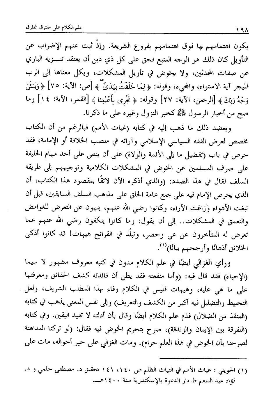 ويعضد ذلك ما ذهب إليه في كتابه (غياث الأمم) فبالرغم من أن الكتاب مخصص لعرض الفقه السياسي الإسلامي وآرائه في منصب الخلافة أو الإمامة، فقد حرص في باب (تفضيل ما إلى الأئمة والولاة) على أن ينص على أحد مهام الخليفة على صرف المسلمين عن الخوض في المشكلات الكلامية وتوجيههم إلى طريقة السلف فقال في هذا الصدد: (والذي أذكره الآن لائقًا لمقصود هذا الكتاب، أن الذي يحرص الإمام فيه على جمع عامة الخلق على مذاهب السلف السابقين، قبل أن نبغت الأهواء وزاغت الآراء، وكانوا رضي الله عنهم، ينهون عن التعرض للغوامض والتعمق في المشكلات.. إلى أن يقول: وما كانوا ينكفون رضي الله عنهم عما تعرض له المتأخرون عن عي وحصر، وتبلّد في القرائح هيهات! قد كانوا أذكى الخلائق أذهانًا وأرجحهم بيانًا) (1) .